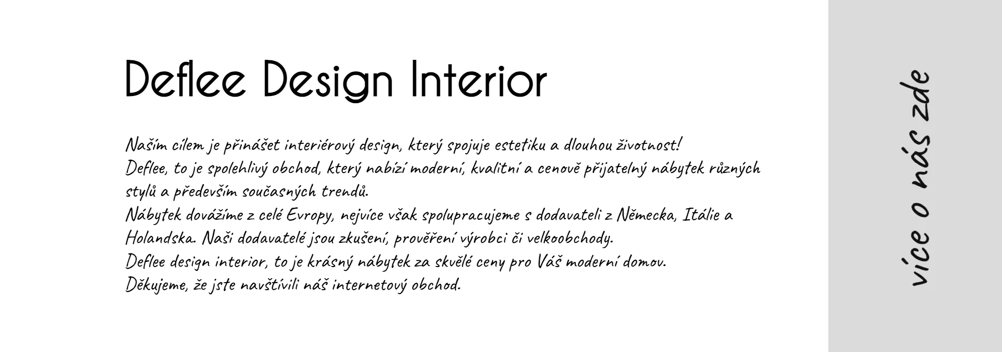 Obrovský výběr interiérového nábytku, dále nabízíme designová svítidla, stylové dekorace, kvalitní nábytek z masivního dřeva, moderní zrcadla, textilní doplňky, koberce a mnoho dalšího. Náš eshop Vám nabízí více jak 40 tisíc produktů.