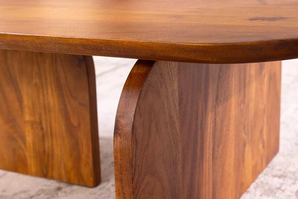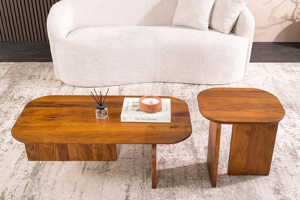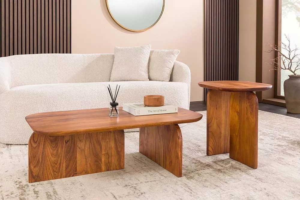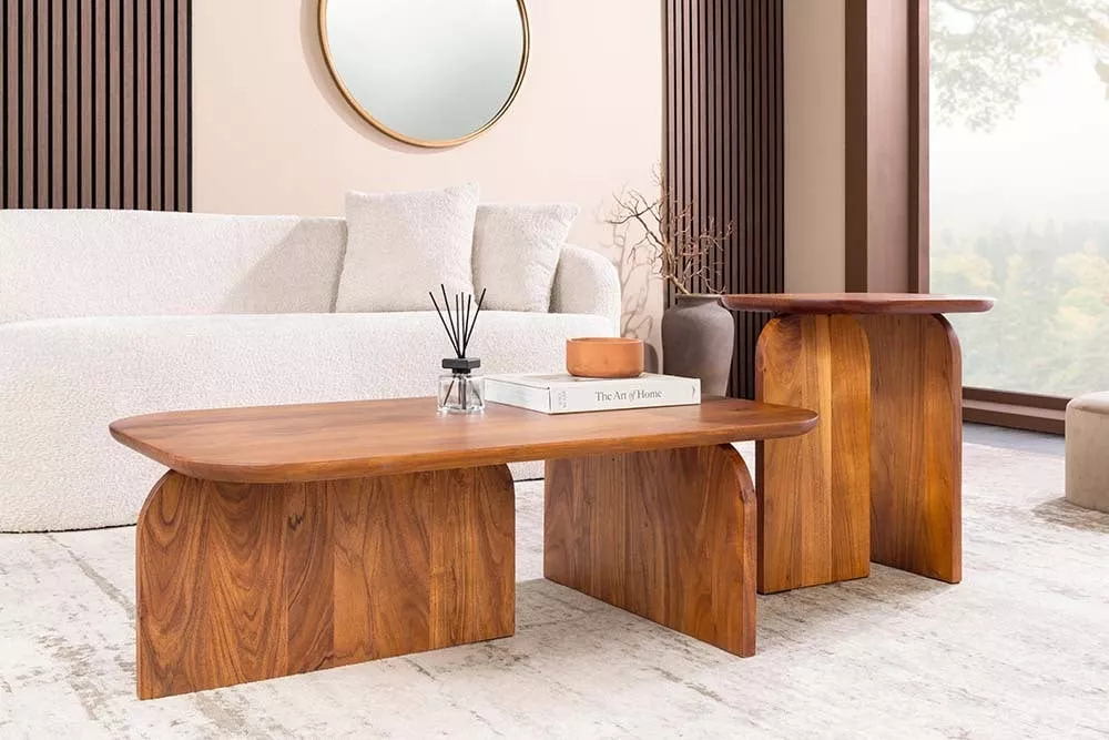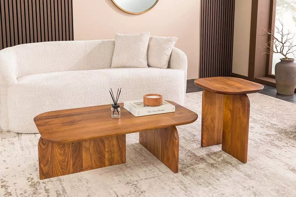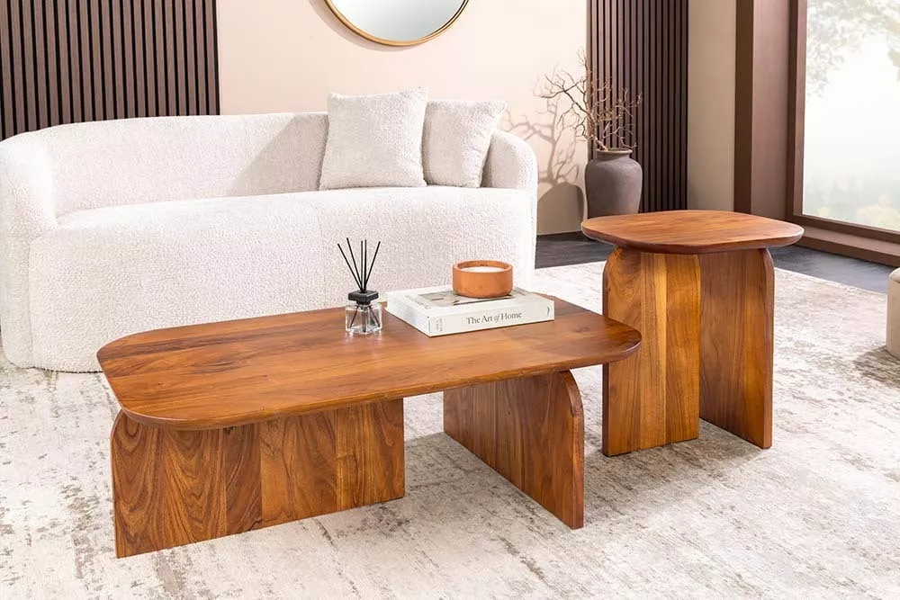 Set dvou konferenčních stolků GATSBY z masivního akáciového dřeva je stylový a praktický doplněk, který zaujme svými organickými tvary a přirozenou kresbou dřeva. Harmonicky zaoblené desky působí elegantně a dodávají interiéru jemný, moderní charakter. Stolky lze využít společně jako designový celek nebo samostatně jako odkládací stolky, což přináší maximální flexibilitu při zařizování prostoru. Díky kvalitnímu zpracování a pevnému masivu jsou stolky ideální pro každodenní použití a skvěle se hodí do moderních, skandinávských i přírodně laděných interiérů, kde propojují funkčnost s nadčasovým designem.