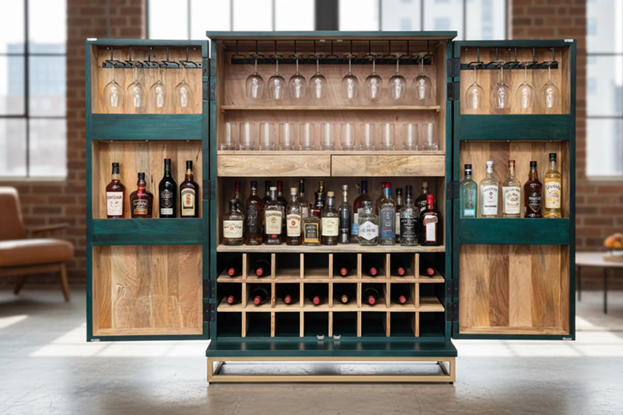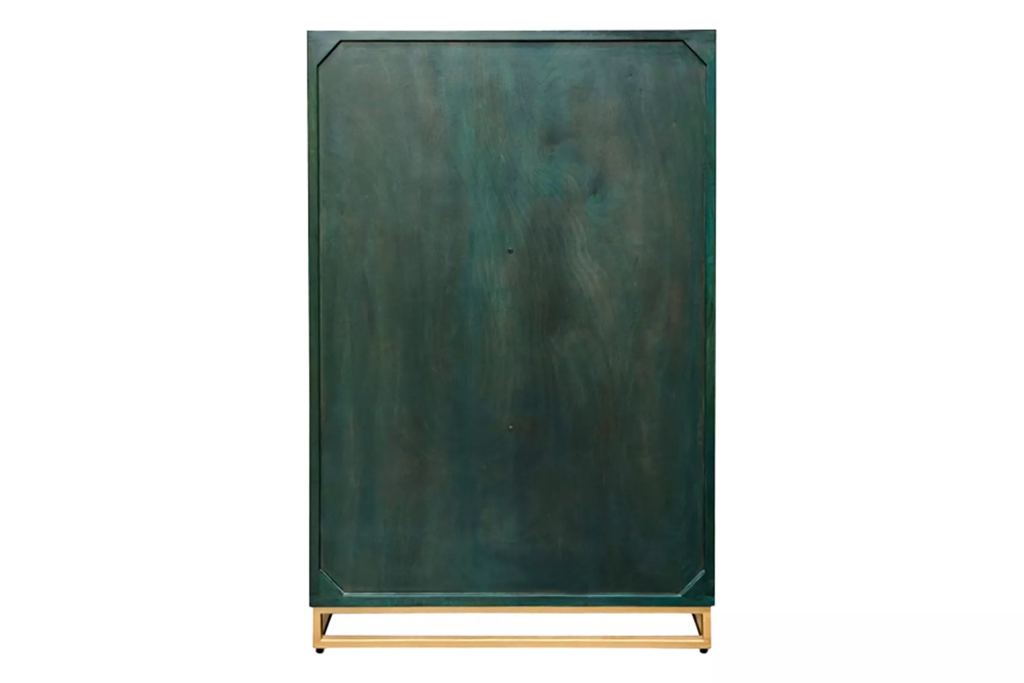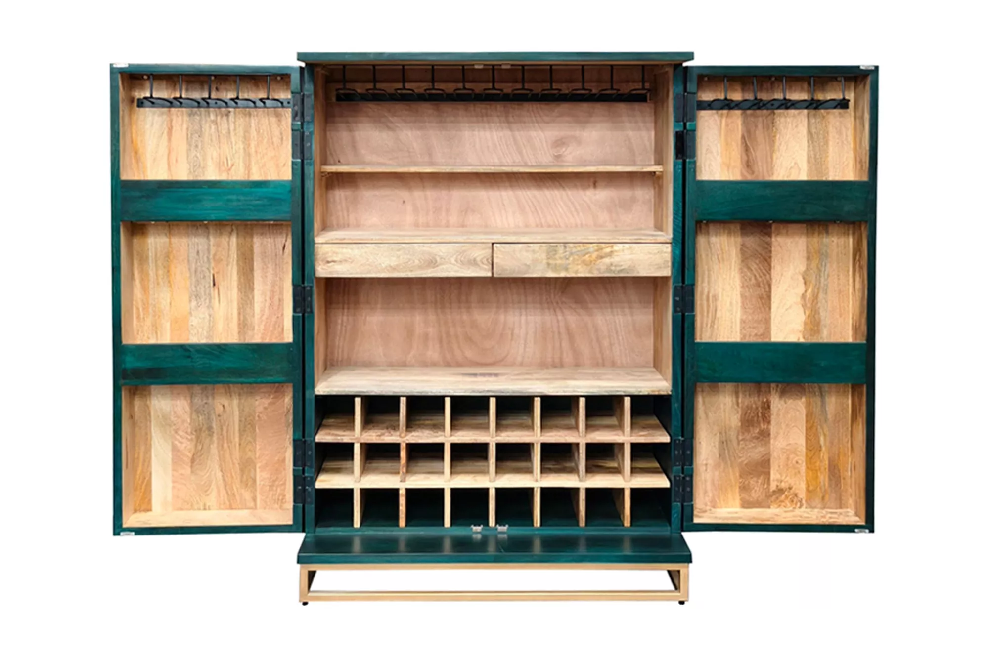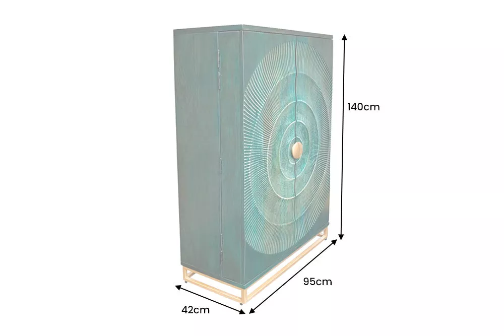 Barová skříň GOLDEN SUNSET v tyrkysovo-zlatém provedení promění váš prostor v luxusní domácí bar. Masivní mangové dřevo doplňují zlaté detaily a ručně provedená přední výzdoba dodává jedinečný charakter. Uvnitř najdete vyjímatelný regál pro 24 lahví, prostor pro sklenice i bohaté úložné možnosti — vše připraveno pro stylovou prezentaci i praktické použití.