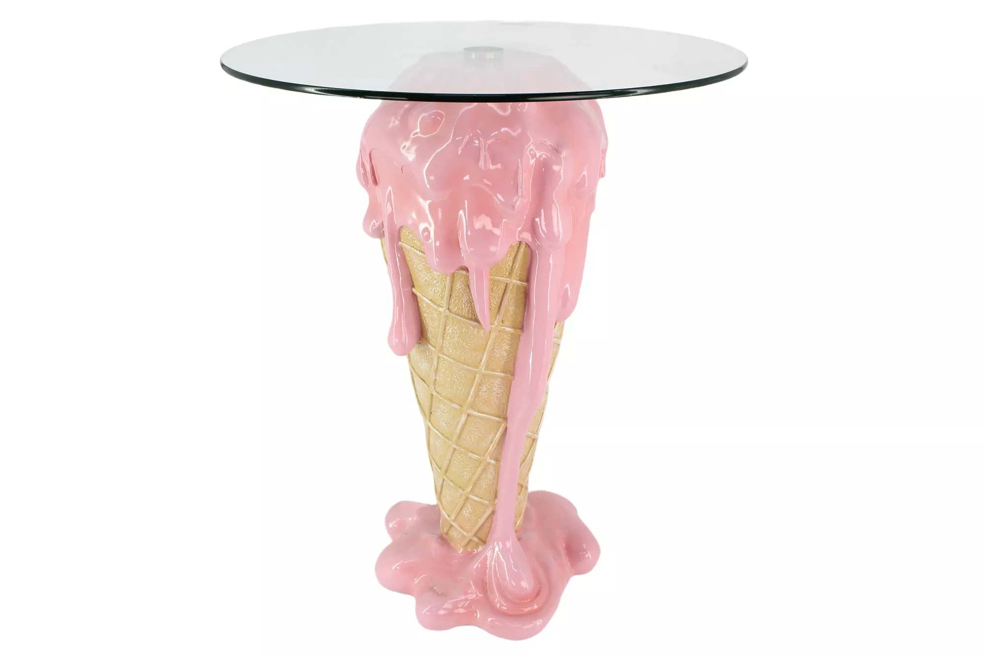 Bistro stolek ICE CREAM 75 cm je výjimečný designový bistro stůl s transparentní kulatou deskou z bezpečnostního skla a výrazným podstavcem v podobě stylizovaného zmrzlinového kornoutu v béžovo-růžových barvách, který je ručně vyrobený a každý kus je unikatní. Tento dekorativní Pop-Art kousek přináší do moderních kuchyní, barových koutů nebo lounge prostor hravý a kreativní akcent, díky kterému se stane středem pozornosti vašeho interiéru.