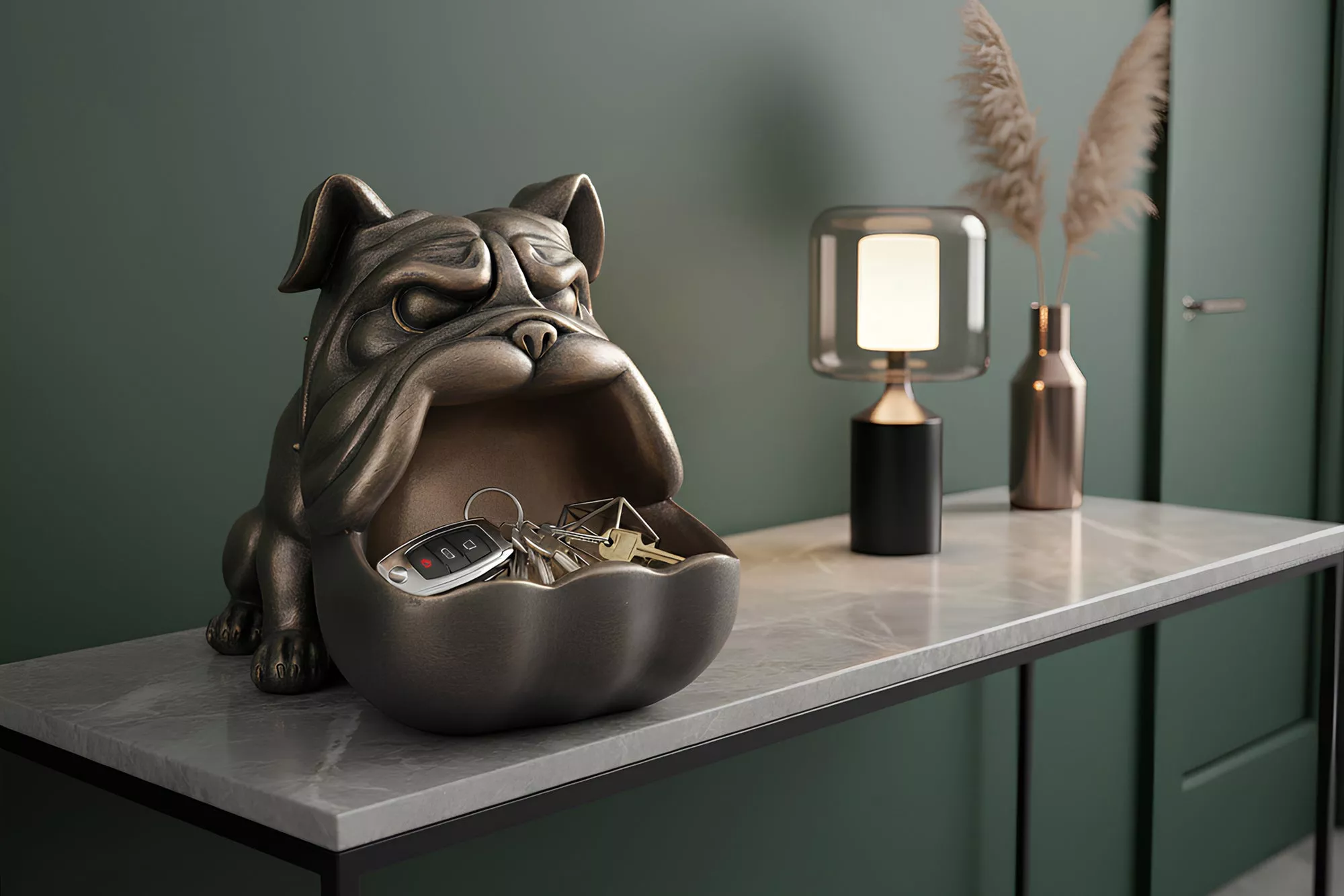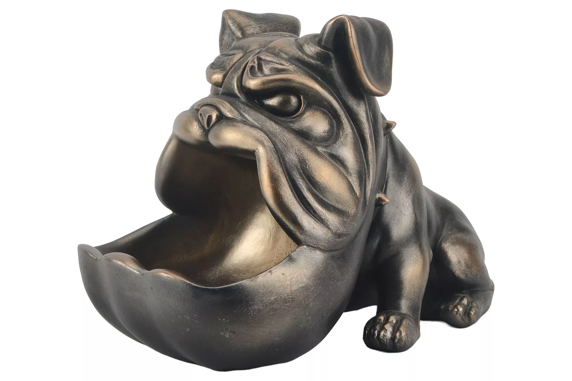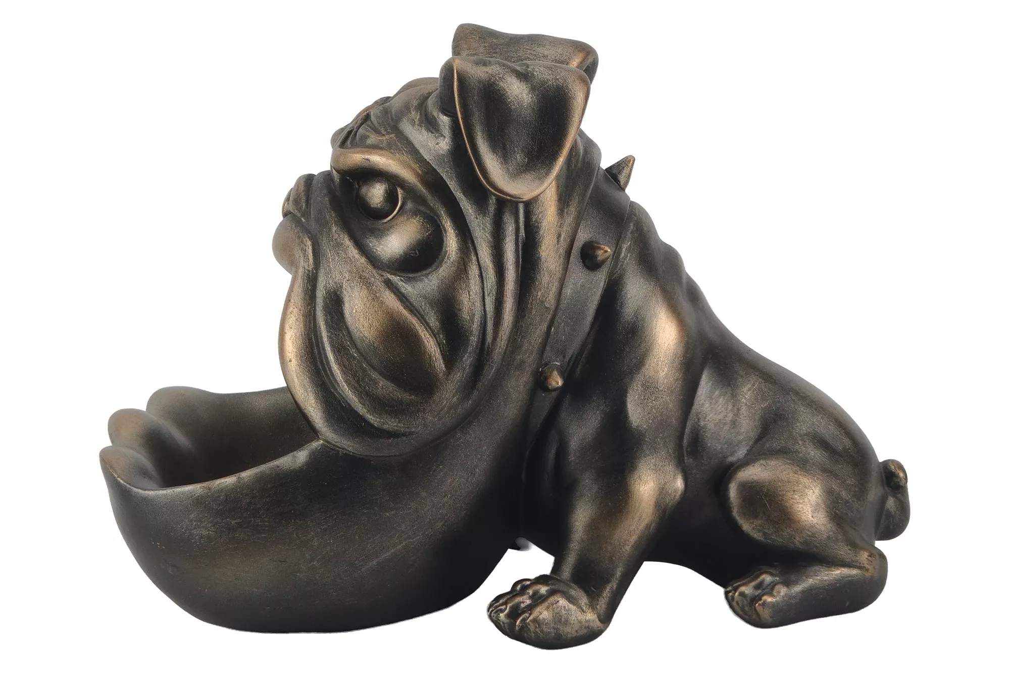 Dekorativní mísa BULLDOG v bronzové barvě přináší do interiéru výrazný a stylový designový prvek. Detailně zpracovaná socha buldoka nabízí praktický odkládací prostor v podobě integrované mísy, která je ideální pro klíče, drobnosti nebo malé dekorace. Tato ručně vyrobená dekorace kombinuje estetický vzhled s funkčním využitím a je vhodná do chodby, obývacího pokoje i na konzolový stolek nebo komodu.