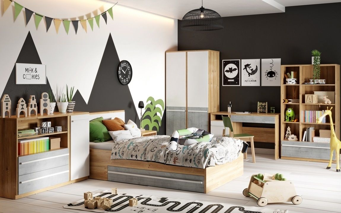 Sestava dětského pokoje FLAMY SET2 (2+3+5+6+10) dub nash/šedá/bílá