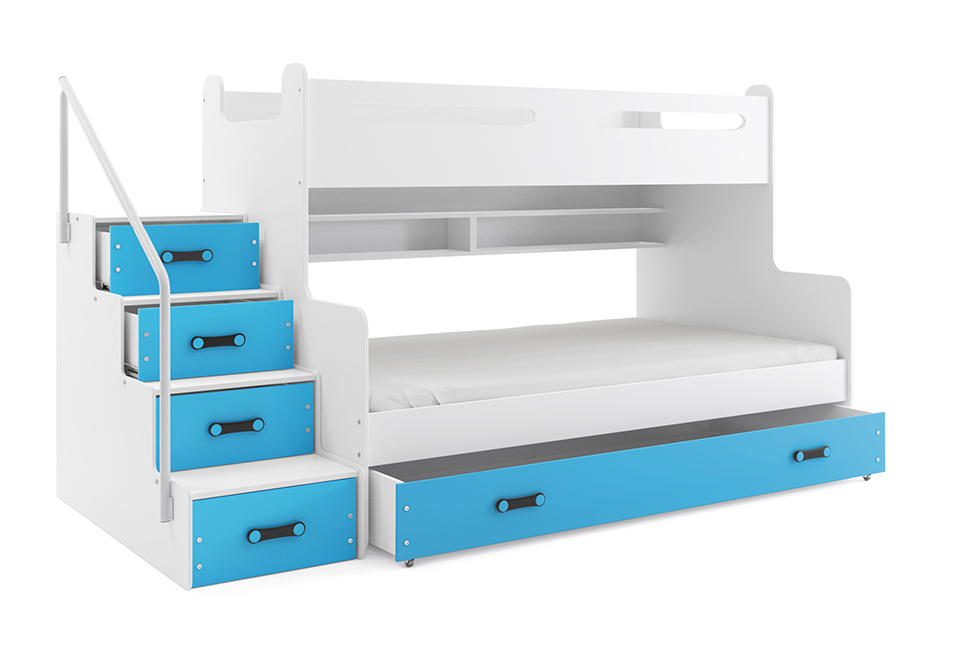 Dětská patrová postel Maty je určena pro ty, kteří pro své děti hledají funkčnost, moderní design a kvalitu. Její stabilní konstrukce, zaoblené hrany a zábrana na horní posteli, zajišťují bezpečnost a pohodlí dítěte. Postel nabízí prostor pro spaní až pro 3 děti a také spoustu úložných prostorů, které jsou v dětském pokoji nepostradatelné. Úložný prostor se skrývá ve spodní výsuvné části a také ve schůdkách, které vedou na vrchní část postele. Díky tomuto netradičnímu řešení, jsou schůdky dostatečně velké a bezpečné. Pro větší bezpečí Vašich dětí je na schůdkách umístěno zábradlí a vrchní postel má zvýšenou bočnici, která slouží jako zábrana. Součástí postele jsou 2 rošty a 2 pěnové matrace, plocha pro spaní je 1x 80x200 cm a 1x 120x200 cm. Postel nabízíme v několika barevných provedeních. Doporučená nosnost horního lůžka 70 kg, spodního lůžka 70 kg. Postel je dodávaná v demontu. Součástí balení je montážní návod včetně všech spojovacích prvků. Vyobrazené doplňky a dekorace nejsou v ceně. Zobrazení barev na fotografii se může od skutečnosti nepatrně lišit.