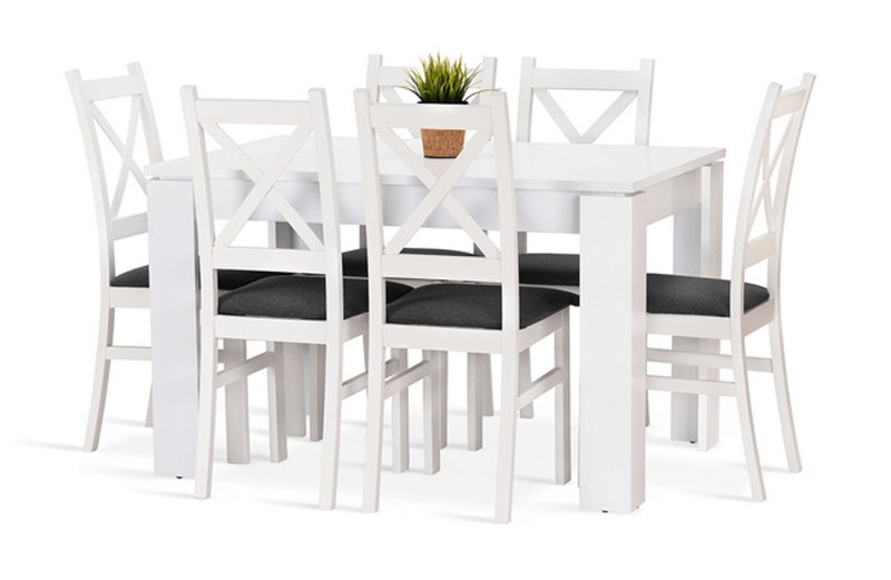 Jídelní sestava Iris 6 se skládá ze stolu a šesti židlí. Tato jídelní sestava svou vysokou kvalitou a precizním zpracováním uspokojí všechny budoucí uživatele. Stůl je vyrobený z bílého matného lamina tl.22 mm, kostry židlí z bukového dřeva, barveného na bílou barvu. Jídelní sestava je dodávaná v demontu. Součástí balení je schématický montážní návod, včetně všech potřebných spojovacích prvků. Cena je uvedena za jídelní stůl a 6 židlí. Vlivem nastavení monitorů, nebo displejů telefonů, se zobrazení barev na fotograii může od skutečnosti lišit.