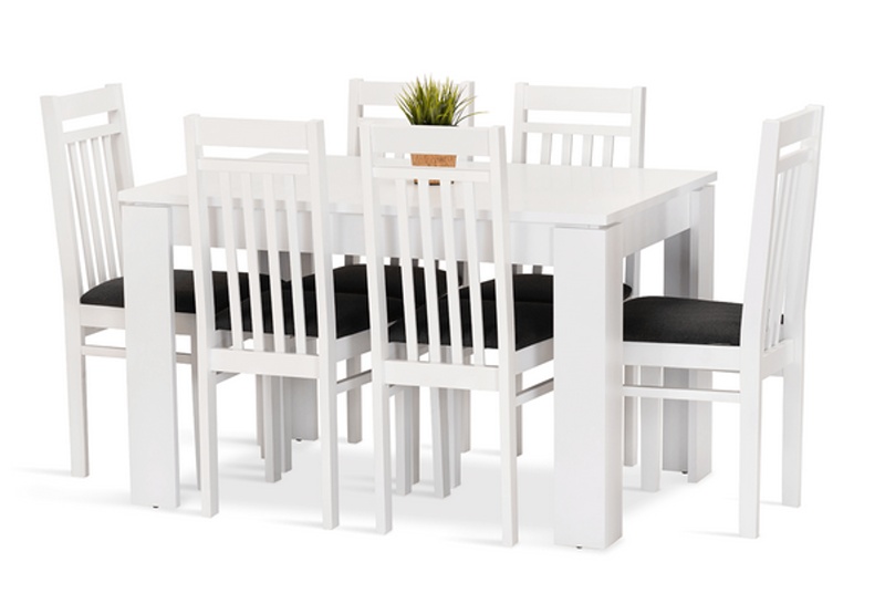 Jídelní sestava Dante 6 se skládá ze stolu a šesti židlí. Tato jídelní sestava splní svůj účel na výbornou nejen v kuchyni, ale i v jídelně, nebo obývacím pokoji s jídelním koutem. Svou vysokou kvalitou a precizním zpracováním, uspokojí všechny budoucí, i ty velmi náročné, uživatele. Stůl je vyrobený z bílého matného lamina tl.22 mm, kostry židlí z bukového dřeva, barveného na bílou barvu. Jídelní sestava je dodávaná v demontu. Součástí balení je schématický montážní návod, včetně všech potřebných spojovacích prvků. Cena je uvedena za jídelní stůl a 6 židlí. Vlivem nastavení monitorů, nebo displejů telefonů, se zobrazení barev na fotograii může od skutečnosti lišit. Úvodní fotografie je ilustrační. Židle budou dodané v modré barvě.