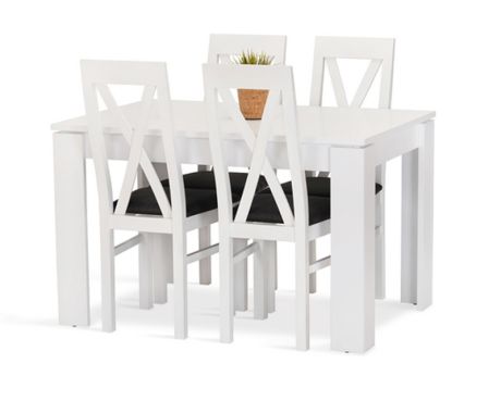 Jídelní sestava Valdo 4 se skládá ze stolu a čtyř židlí. Tato jídelní sestava splní svůj účel na výbornou nejen v kuchyni, ale i v jídelně, nebo obývacím pokoji s jídelním koutem. Svou vysokou kvalitou a precizním zpracováním, uspokojí všechny budoucí, i ty velmi náročné, uživatele. Stůl je vyrobený z bílého matného lamina tl.22 mm, kostry židlí z bukového dřeva, barveného na bílou barvu. Jídelní sestava je dodávaná v demontu. Součástí balení je schématický montážní návod, včetně všech potřebných spojovacích prvků. Cena je uvedena za jídelní stůl a 4 židle. Vlivem nastavení monitorů, nebo displejů telefonů, se zobrazení barev na fotograii může od skutečnosti lišit.