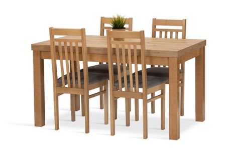 Jídelní sestava Meteor 4 se skládá z rozkládacího stolu a čtyř židlí. Tato jídelní sestava splní svůj účel na výbornou nejen v kuchyni, ale i v jídelně, nebo obývacím pokoji s jídelním koutem. Svou vysokou kvalitou a precizním zpracováním, uspokojí všechny budoucí, i ty velmi náročné, uživatele. Nohy stolu a kostry židlí jsou vyrobeny z bukového dřeva, mořeného tak, aby ladily s deskou stolu, která je vyrobená z lamina v dekoru dub artisan. Jídelní sestava je dodávaná v demontu. Součástí balení je schématický montážní návod, včetně všech potřebných spojovacích prvků. Cena je uvedena za jídelní stůl a 4 židle. Vlivem nastavení monitorů, nebo displejů telefonů, se zobrazení barev na fotograii může od skutečnosti lišit. Úvodní fotografie je ilustrační. Židle budou dodány v zelené barvě.