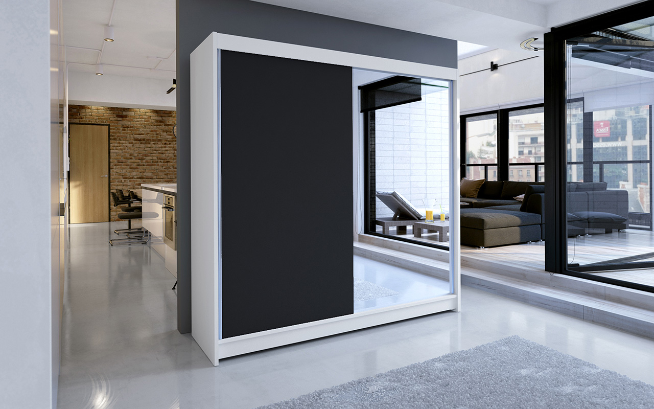 Skříň je vyrobena z kvalitního lamina. Díky svému vnitřnímu uspořádání nabízí dostatek úložného prostoru, posuvné dveře šetří prostor a zrcadlo ho opticky zvětšuje. Skříň je vhodná do ložnice, dětského nebo studentského pokoje, do předsíně i kanceláře. Vnitřní uspořádání skříně je vyobrazeno na fotografii. Skříň je dodávána v demontu. Součástí je i skleněné zrcadlo, které je nalepeno na jedné části dveří skříně a také montážní plánek včetně všech potřebných spojovacích materiálů. Vyobrazené dekorace nejsou v ceně.