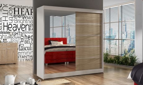 Skříň je vyrobena z kvalitního lamina. Díky svému vnitřnímu uspořádání nabízí dostatek úložného prostoru, posuvné dveře šetří prostor a zrcadlo ho opticky zvětšuje. Skříň je vhodná do ložnice, dětského nebo studentského pokoje, do předsíně i kanceláře. Vnitřní uspořádání skříně je vyobrazeno na fotografii. Skříň je dodávána v demontu. Součástí je i skleněné zrcadlo, které je nalepeno na jedné části dveří skříně a také montážní plánek včetně všech potřebných spojovacích materiálů. Vyobrazené dekorace nejsou v ceně.