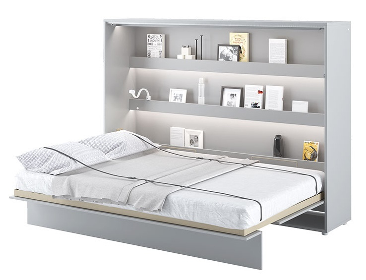 Široká výklopná postel 140 šedá mat. Rozměry viz obrázek. Se sklápěcí postelí Vás už nebude trápit malý prostor Vaší domácnosti. Díky stabilní konstrukci zaručuje pohodlný odpočinek. Pneumatický mechanismus sklápění postele zajistí bezpečné otevírání a je doplněn SOFT CLOSE systémem tichého zavírání. Tento výjimečný systém Vám umožní manipulaci pouze jedním prstem. Když je postel sklopená, vypadá jako běžná skříň. Vyklopením se vytáhne celá šířka postele. Při lozložení postele má hloubku 168 cm. Uvnitř skříně jsou praktické police na knížky nebo dekorační předměty, vše máte na dosah ruky. Maximální zatížení polic je 5 kg. Rám je nutno přišroubovat ke zdi, nosnost postele je 200 kg. Rošt postele je v ceně, matrace není součástí, je potřeba ji dokoupit. Doporučujeme velikost 140 x 200 x výšku do 18 cm. Po sklopení postele vzniká prostor pod postelí o výšce 24,9 cm. Nábytek je vyroben z kvalitního lamina s ABS hranou. Lamino je odolné proti poškrábání, poškození, vlhkosti a vysokým teplotám. Postel nabízíme v několika velikostech a barevných provedeních. K posteli je možné dokoupit LED osvětlení. Dodáváme v demontovaném stavu. Můžete si prohlédnout prezentační video, klikněte ZDE.