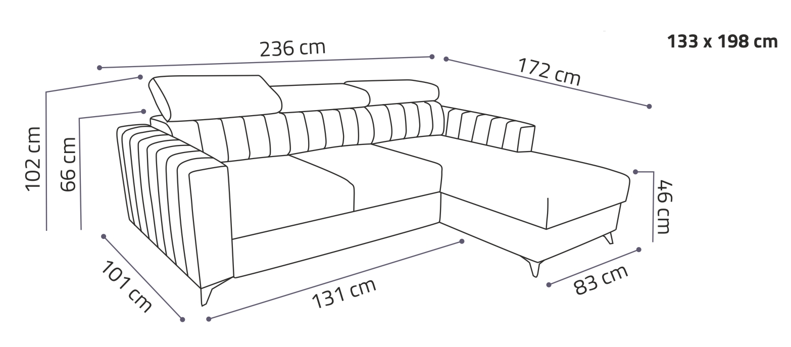Sedací souprava Mildred osloví každého, kdo preferuje moderní vzhled a zároveň pohodlí a praktičnost. Je potažena kvalitní potahovou látkou s kontrastním prošitím. Sedací souprava je velmi pohodlná a dostatečně velká na posezení s přáteli, nebo rodinou. Pro případ, že se návštěva zdrží přes noc, je sedací souprava vybavena rozkladem, díky kterému sedací soupravu jednoduše přeměníte v prostorné lůžko. Sedací souprava má praktický úložný prostor, který můžete využít např., na lůžkoviny. Pohodlí při sezení zajišťuje výplň sedáků, kterou tvoří kombinace pružin faliste s kvalitní PUR pěnou. Komfort a pohodlí při odpočinku zvyšuje polohovací opěrka hlavy. Sedací soupravu nabízíme v levém i pravém provedení.