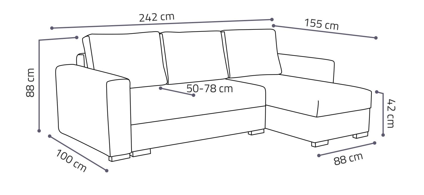 Loreta Premium je moderní rohová sedací souprava s nadčasovým designem. Její předností je pohodlí, praktičnost a univerzální použití. Můžete si ji podle potřeby sestavit jako levou nebo pravou, což je výhoda při zařizování obývacího pokoje. Nemusíte přemýšlet do jakého rohu postavíte sedací soupravu, jednoduše ji podle potřeby přizpůsobíte. Pohodlí při sezení zajišťuje kombinace pružin faliste s kvalitní PUR pěnou a velké opěrné polštáře, které jsou odnímatelné, takže si je můžete přizpůsobit svým potřebám. Praktickou stránkou sedací soupravy je úložný prostor a možnost rozložení k občasnému přespání Vaší návštěvy. Sedací souprava je potažena jednobarevnou látkou Poso, která se vyznačuje sametově jemným povrchem a svým typickým vzhledem připomíná manšestr. V nabídce najdete více barevných variant. V ceně sedací soupravy jsou 3 velké opěrné polštáře. Ostatní vyobrazené dekorace nejsou v ceně. Správná barva potahové látky je zobrazena na první fotografii. Ostatní fotografie jsou pouze ilustrační.