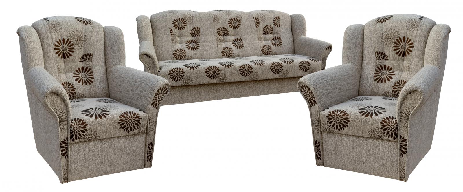 Klasická rozkládací sedací souprava vhodná také do menších bytů. Sedací souprava má praktický úložný prostor a jednoduchým rozkladem vznikne lůžko vhodné k příležitostnému spaní. Sedací souprava je pružinová v kombinaci s kvalitní PUR pěnou. Sedací souprava se skládá z rozkládacího trojsedu a dvou křesel. Tato sedačka je očalouněná kvalitní potahovou látkou, snadno čistitelnou suchou pěnou.