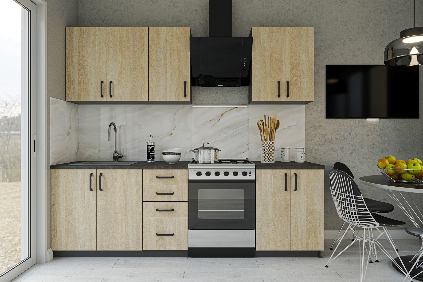 Dřez, pracovní deska, sokl nejsou v ceně. Spotřebiče nejsou součástí kuchyňské linky. Dodáváme v demontovaném stavu.