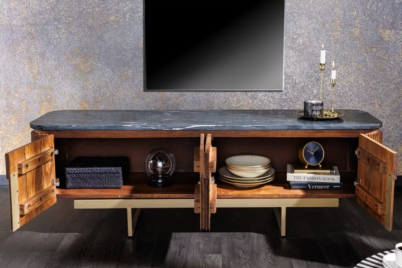Televizní stolek GATSBY z masivního mangového dřeva s mramorovou horní deskou představuje dokonalou kombinaci luxusu, jedinečného designu a praktičnosti. Na první pohled zaujme svým plastickým rýhovaným reliéfem na přední straně, který propůjčuje nábytku osobitý a neotřelý vzhled. Mramorová deska na vrchu komody přináší estetické i praktické výhody, péče o ní je velmi jednoduchá - stačí otřít vlhkým hadříkem a máte hotovo. Mimo to působí velmi elegantně a luxusně. Každý kus je vyráběn ručně, což zajišťuje, že žádné dva televizní stolky nejsou zcela stejné – každý kus je originál, který se může pyšnit svou vlastní jedinečnou strukturou a detaily. Přírodní barva mangového dřeva spolu se zlatými nohami a detaily na přední straně působí elegantně a harmonicky, díky čemuž se stolek hodí do různých stylů interiérů, od moderního po rustikální.