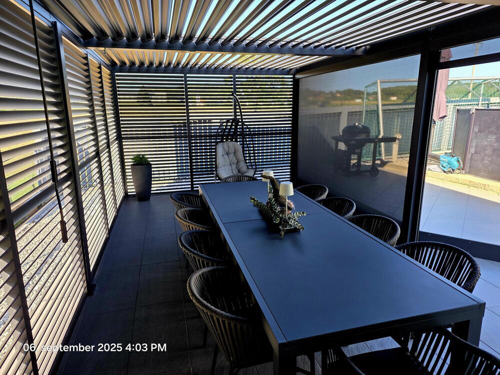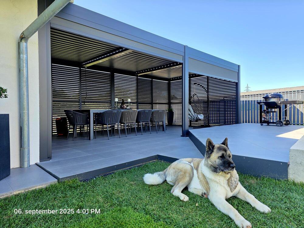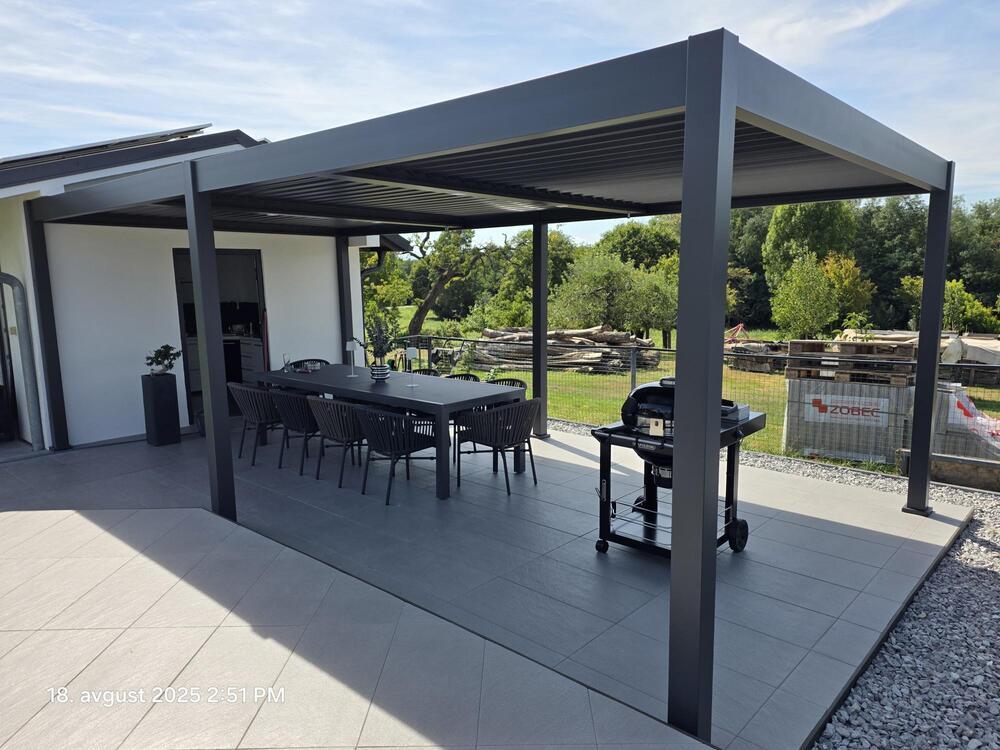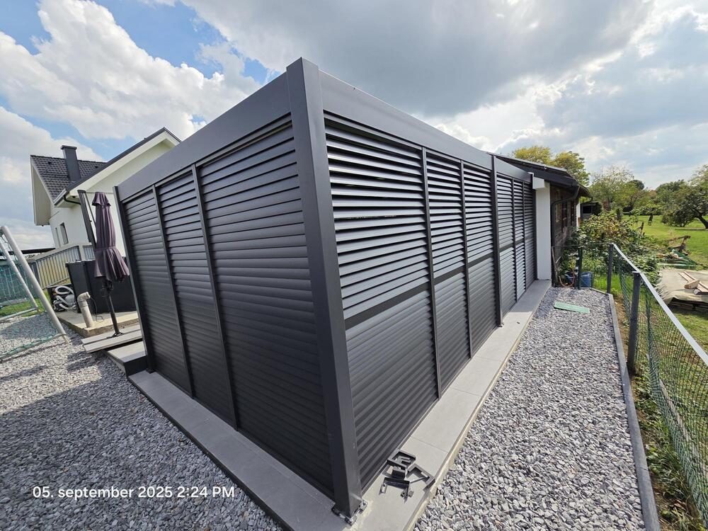 Prémiová zahradní hliníková volně stojící bioklimatická pergola o rozměrech 7,2x3,6 metry představuje ideální způsob zastřešení Vašeho venkovního posezení. Velmi pevná a stabilní konstrukce v antracitové barvě RAL 7016, v matné povrchové úpravě se hodí do každého prostoru, není zapotřebí vrtat do stěny. Pergola je vyrobena z vysoce kvalitního hliníku, který je ošetřen práškovou barvou, což zaručuje odolnost vůči povětrnostním vlivům. Lamely jsou rozděleny na 3 zóny a každou tuto část je možné ovládat zvlášť. 69 nastavitelných otočných lamel Vás ochrání nejen před sluncem, ale i před deštěm. Lamely lze otáčet od 0°, kdy docílíte úplně uzavřené střechy až do 135°, díky čemuž získáte skvělou mobilitu a možnost zastínit slunce z jakékoliv strany. Lamely lze ovládat jednoduše manuálně pomocí kličky. Ta je navržena tak, abyste lamely mohli snadno otočit do požadované polohy a aby při otáčení lamel nedocházelo k poškrábání konstrukce pergoly. Zároveň je klička na konstrukci umístěna tak, aby při doplnění pergoly o zástěny či panely nebránila ve snadné manipulaci s těmito doplňky. Kličku můžete jednoduše sundat. Ke svodu vody dochází unikátním drenážním systémem přímo uvnitř konstrukce. Lamely jsou schopné odvést opravdu velké množství vody až 17 l/m2 za hodinu.V zimních měsících je zapotřebí ponechat lamely ve svislé pozici. I přesto jsou lamely schopné unést 30-40 centimetrovou vrstvu sněhu, což představuje zátěž přibližně 50 kg/m2. Toto zatížení však nemůže být dlouhodobé. Kteroukoliv stranu pergoly lze doplnit o zástěnu. V nabídce máme různé rozměry zástěn s hliníkovou konstrukcí a výplní z textilenu, které poskytnou ochranu před větrem a zároveň vytvoří příjemný stín. Pergolu je také možné doplnit o stínicí panely s fixními či sklápěcími horizontálními lamelami pro dodatečné soukromí a zastínění. Díky skvělým vlastnostem, detailnímu zpracování a modernímu designu bioklimatické pergoly využijete venkovní posezení mnohem častěji. Robustní sloupek má rozměry 116x116 mm, při instalaci je zapotřebí počítat s patkou sloupku o rozměrech 160x160 mm. Patka je z 8 mm silné oceli a je navíc zakryta hliníkovým krytem s integrovaným drenážním systémem. Vyvýšený hliníkový profil s přidanou horní lištou ukrývá lamely tak, že z bočního pohledu nejsou viditelné a jsou v jedné linii s profilem. Mezi jednotlivými zónami s lamelami jsou pevné nosníky, do kterých se nemusíte bát instalovat například osvětlení. S bioklimatickou pergolou si můžete užívat maximum slunečních paprsků, zároveň se můžete proti těmto paprskům i chránit správným nastavením lamel. Pergola též umožňuje snadnou ventilaci prostoru a naopak dokonalý přístřešek v případě deště. HLAVNÍ VÝHODY 69 hliníkových lamel rozdělená střešní část na 3 zóny flexibilnější lamely s úhlem otočení od 0° do 135° vyvýšená horní lišta hliníkového profilu - lamely nejsou vidět ani při otáčení integrovaný drenážní systém celohliníková konstrukce - silné nosníky nejsou viditelné spojovací prvky, šrouby - hladká konstrukce ROZMĚRY PERGOLYšířka výrobku: | 720 cm |