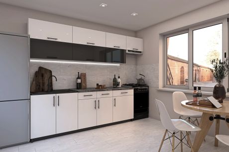 Moderní a levná kuchyně. Tato kuchyně je navržena tak, že skříňky se dají poskládat v libovolném pořadí. To vám umožní si sestavit kuchyni podle svých představ. Korpus je v bílé barvě, části dvířek jsou v bílé lesk a antracit lesk. Nožky jsou regulovatelné. Sokl, pracovní deska, spotřebiče, dřez a digestoř v ceně nejsou.