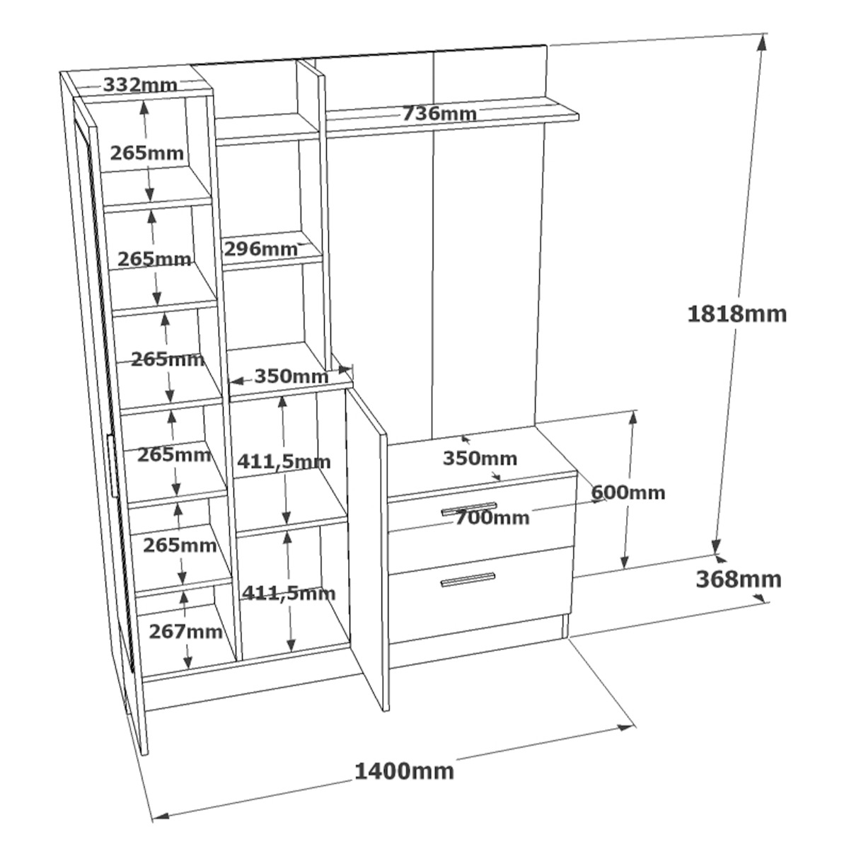 Předsíň je srdcem vašeho domova a předsíňová sestava ji může důstojně reprezentovat. S rozměry 182 x 140 x 35 cm vytváří dostatek úložného prostoru pro vaše věci, a to i v případě omezené plochy.