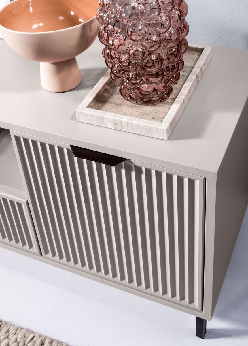 Nábytek je zdoben vzorem na čelních stranách v podobě frézovaných drážek. Všechny kusy nábytku z této kolekce stojí na černých kovových nožkách. Jednoduché a funkční tvary se hodí do obývacího pokoje, ložnice i jídelny.