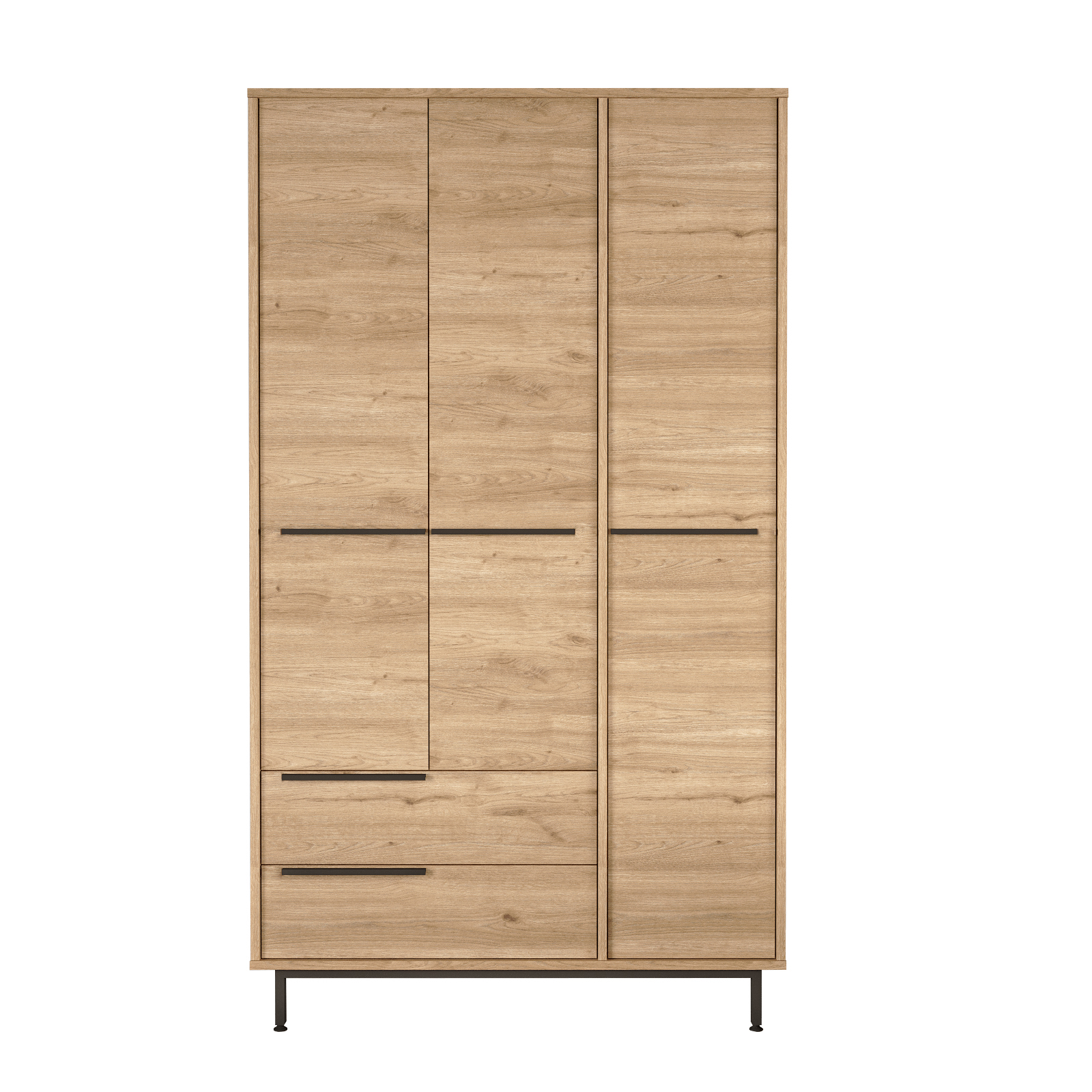 kombinuje praktičnost a elegantní design. Tři dveře skrývají prostor s šatní tyčí pro zavěšení oblečení, zatímco dvě zásuvky a čtyři police poskytují úložné místo pro složené oděvy, doplňky nebo ložní prádlo. Díky promyšlenému uspořádání je tato skříň ideálním řešením pro organizaci a přehlednost.