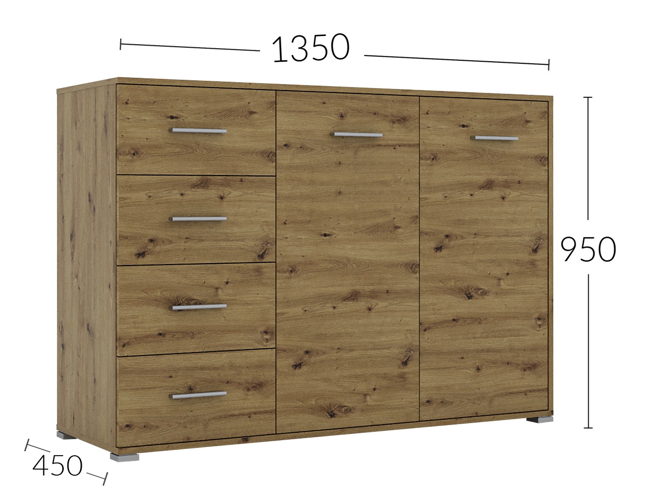 Komoda dvoudveřová se čtyřmi zásuvkami je vyrobená z kvalitní laminátové desky (odolné a ekologicky šetrné) v barevném provedení dub artisan. Kvalitní pojezdy zajišťují hladký a tichý pohyb zásuvek. Dodáváme v demontovaném stavu.