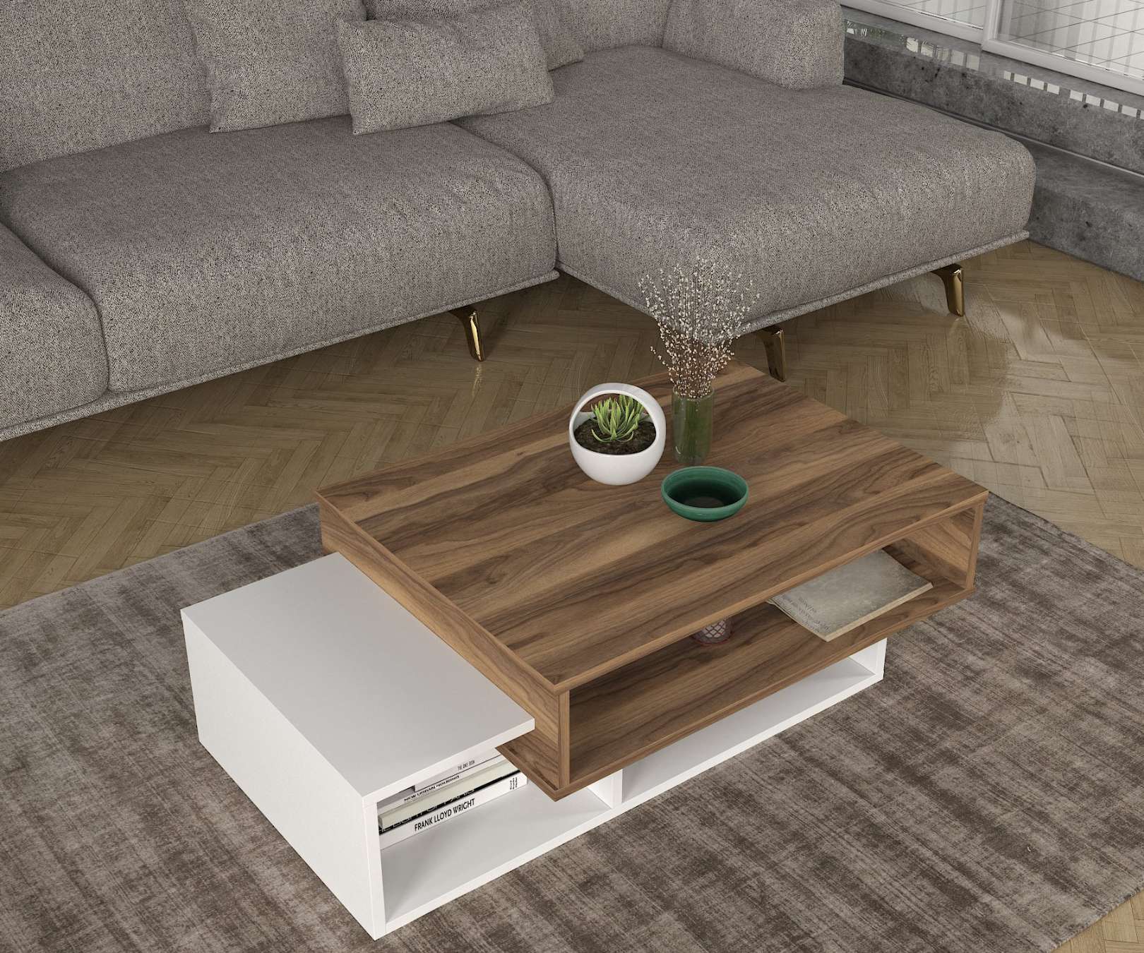 Představujeme konferenční stolek, který přináší do vašeho obývacího pokoje eleganci a funkčnost. Tento stylový nábytek v kombinaci bílé a ořechové barvy je navržen tak, aby poskytoval praktické a estetické řešení pro vaše potřeby.