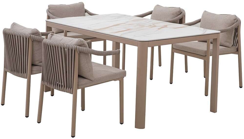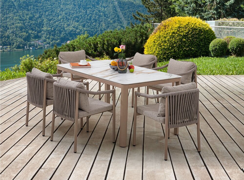 Luxusní hliníková souprava v cappuccino provedení, doplněna o velmi vkusný lankový, neboli provázkový výplet. Moderní souprava, která skvěle zapadne do každého exteriéru či interiéru. Velmi pohodlné podušky z polyesteru s molitanovou výplní (5 cm) jsou odolné UV záření. Všechny podušky jsou vybaveny zipy, díky kterým můžete polyesterový potah tkaniny jednoduše sundat. Souprava má díky použitým materiálům a modernímu vzhledu opravdu široké využití, je vhodná pro vnitřní i venkovní prostory - zahrady, terasy, zimní zahrady nebo třeba do uvítací haly či recepce. Stůl má desku ze slinutého kamene (Slinutý kámen je 100% přírodní materiál na bázi žulových minerálů, minerálů ze skla a přírodních oxidů. Žulové materiály jako křemeny a živce dodávají produktům tvrdost a pevnost. Skleněné minerály a oxid křemičitý zajišťují chemickou stabilitu. Díky jednoduché montáži, budete moci již po chvíli soupravu naplno využít. Křesla jsou stohovatelná.| obsah setu: | 6x křeslo, 1x jídelní stůl |