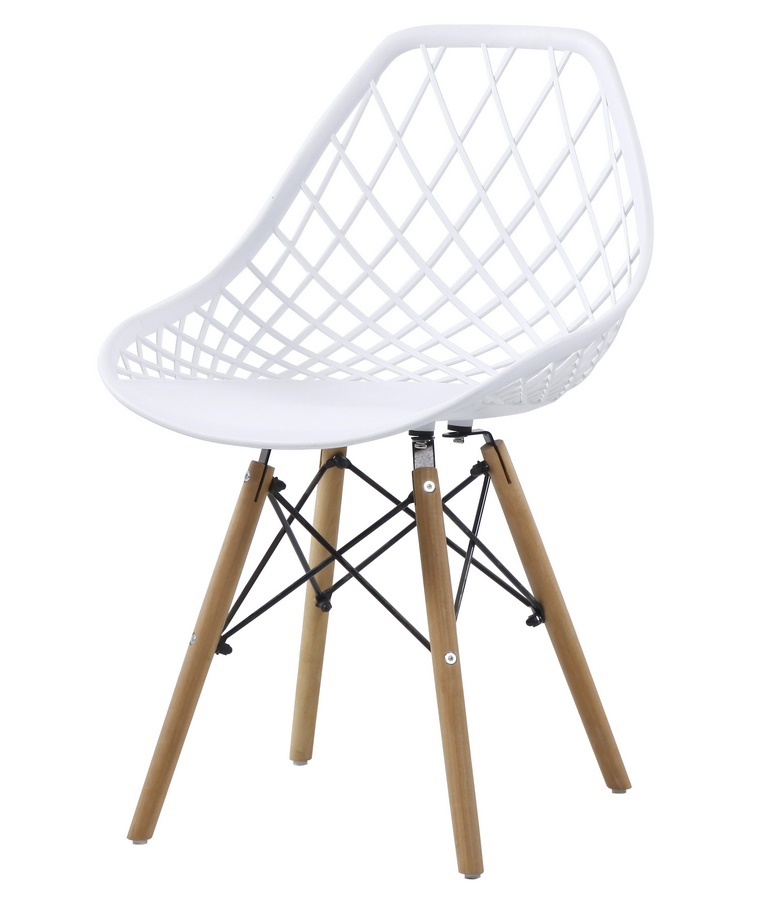 Elegantní židle s ergonomickým tvarem. Zajímavě řešená dřevěná masivní konstrukce v barvě buk s kovovými prvky, sedák je z bílého plastu. Židle se hodí ke stolům, které naleznete v naší uvedené nabídce. Nosnost židle 100 kg. Dodáváme v demontovaném stavu.