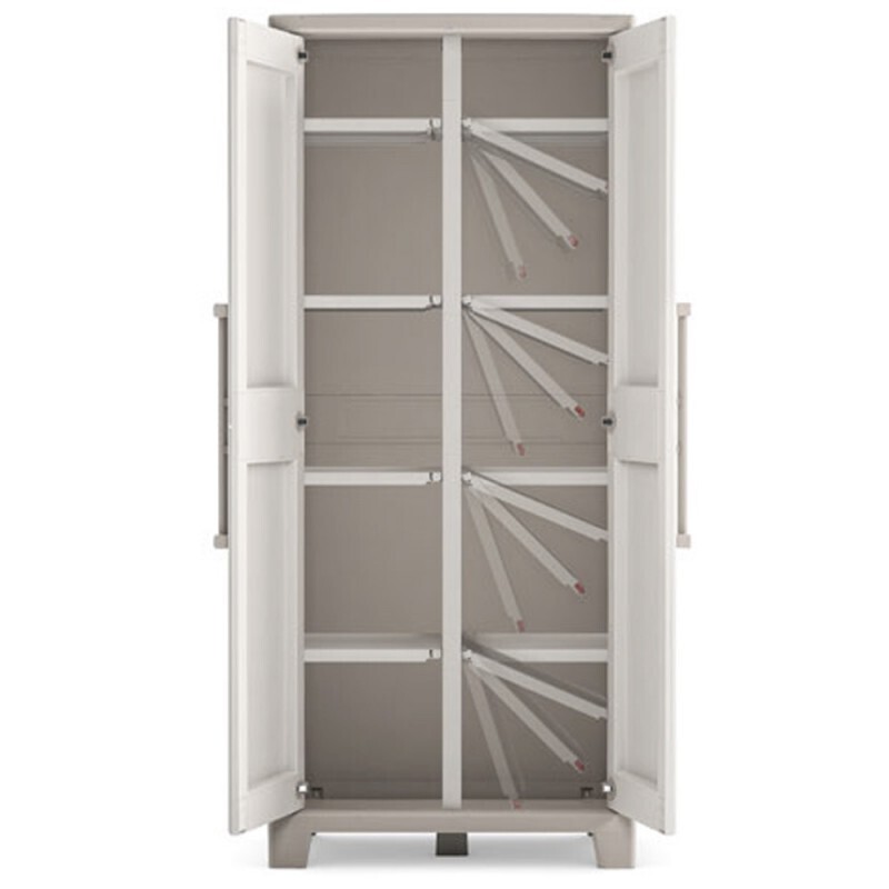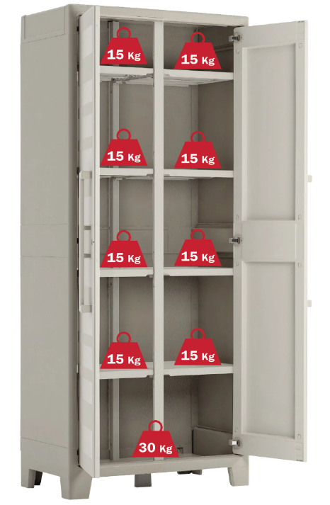 Luxus je mít v zahradě či v dílně vše po ruce! S venkovní skříní GULLIVER MULTISPACE budete mít vše potřebné přímo na vaší zahradě, v garáži či v dílně. Skříň je vyrobena z kvalitního plastu, takže nemusíte řešit problémy s korozí. Když se k dobrým vlastnostem plastu přidá nespočet skvělých vychytávek, vzniká policová skříň GULLIVER MULTISPACE – bytelná a vzhledná ochrana pro zahradnické náčiní, hadice, ale i deky a vše ostatní, co na zahradě potřebujete. Samozřejmě je vhodná i do dílny či garáže. Díky nastavitelným policím snadno umístíte i vysavač, koště či jiné vetší předměty. kvalitní kovové panty zajišťují trvalou funkčnost otvírání a pevné dolehnutí dveří police si snadno přizpůsobíte díky SLO (Security Lock Off), bezpečnostní pojistce skříň pevně stojí na nastavitelných nohách, a tak si můžete jejich výšku přizpůsobit dle libosti pro ještě větší stabilitu je spodek skříně opatřen pátou nohou díky UV ochraně barva vydrží a zachová si svou intenzitu vybavená pacičkami na visací zámek 8 polic, nosnost každé police 15 kg, nosnost dna skříňky 30 kg| šířka výrobku: | 80 cm |