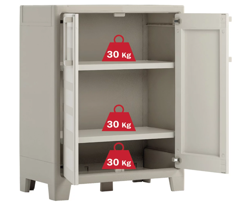 Luxus je mít v zahradě či v dílně vše po ruce! S venkovní skříní GULLIVER LOW budete mít vše potřebné přímo na vaší zahradě, v garáži či v dílně. Skříň je vyrobena z kvalitního plastu, takže nemusíte řešit problémy s korozí. Když se k dobrým vlastnostem plastu přidá nespočet skvělých vychytávek, vzniká policová skříň GULLIVER LOW – bytelná a vzhledná ochrana pro zahradnické náčiní, hadice, ale i deky a vše ostatní, co na zahradě potřebujete. Samozřejmě je vhodná i do dílny či garáže. kvalitní kovové panty zajišťují trvalou funkčnost otvírání a pevné dolehnutí dveří police si snadno přizpůsobíte díky SLO (Security Lock Off), bezpečnostní pojistce skříň pevně stojí na nastavitelných nohách, a tak si můžete jejich výšku přizpůsobit dle libosti pro ještě větší stabilitu je spodek skříně opatřen pátou nohou díky UV ochraně barva vydrží a zachová si svou intenzitu vybavená pacičkami na visací zámek 2 police, nosnost každé police 30 kg, nosnost dna skříňky 30 kg| šířka výrobku: | 80 cm |