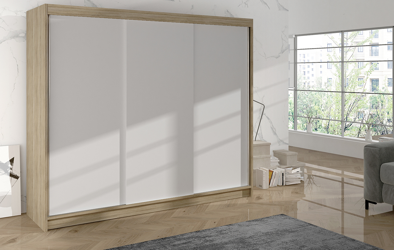 Korpus i dveře jsou vyrobeny z odolné 16 mm laminované desky s ABS hranami, které zajišťují dlouhou životnost. Posuvné dveře se hladce pohybují po hliníkových vodicích lištách. Skříň je dostupná v několika atraktivních barevných provedeních, takže ji snadno sladíte s ostatním nábytkem.