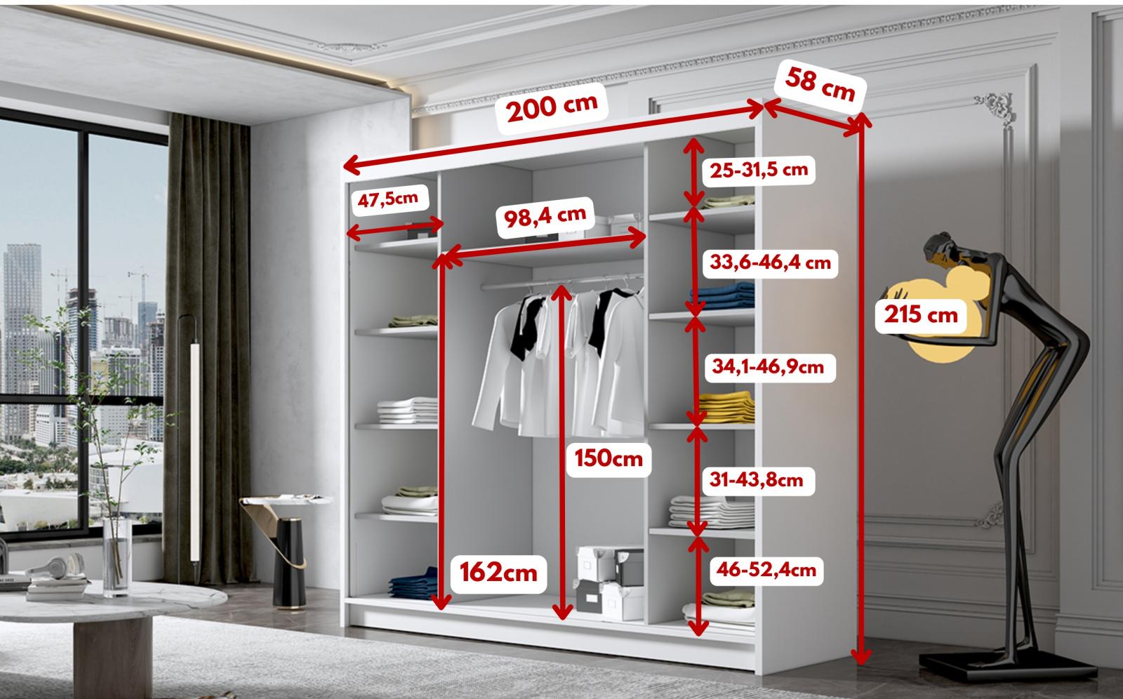 Šatní skříň Debora III v moderním designu má šířku 200 cm a je rozdělena na tři praktické části. Posuvné dveře šetří místo a usnadňují přístup do interiéru. Vnitřní uspořádání kombinuje závěsnou tyč a devět polic, což umožňuje přehledné a praktické rozdělení šatníku.