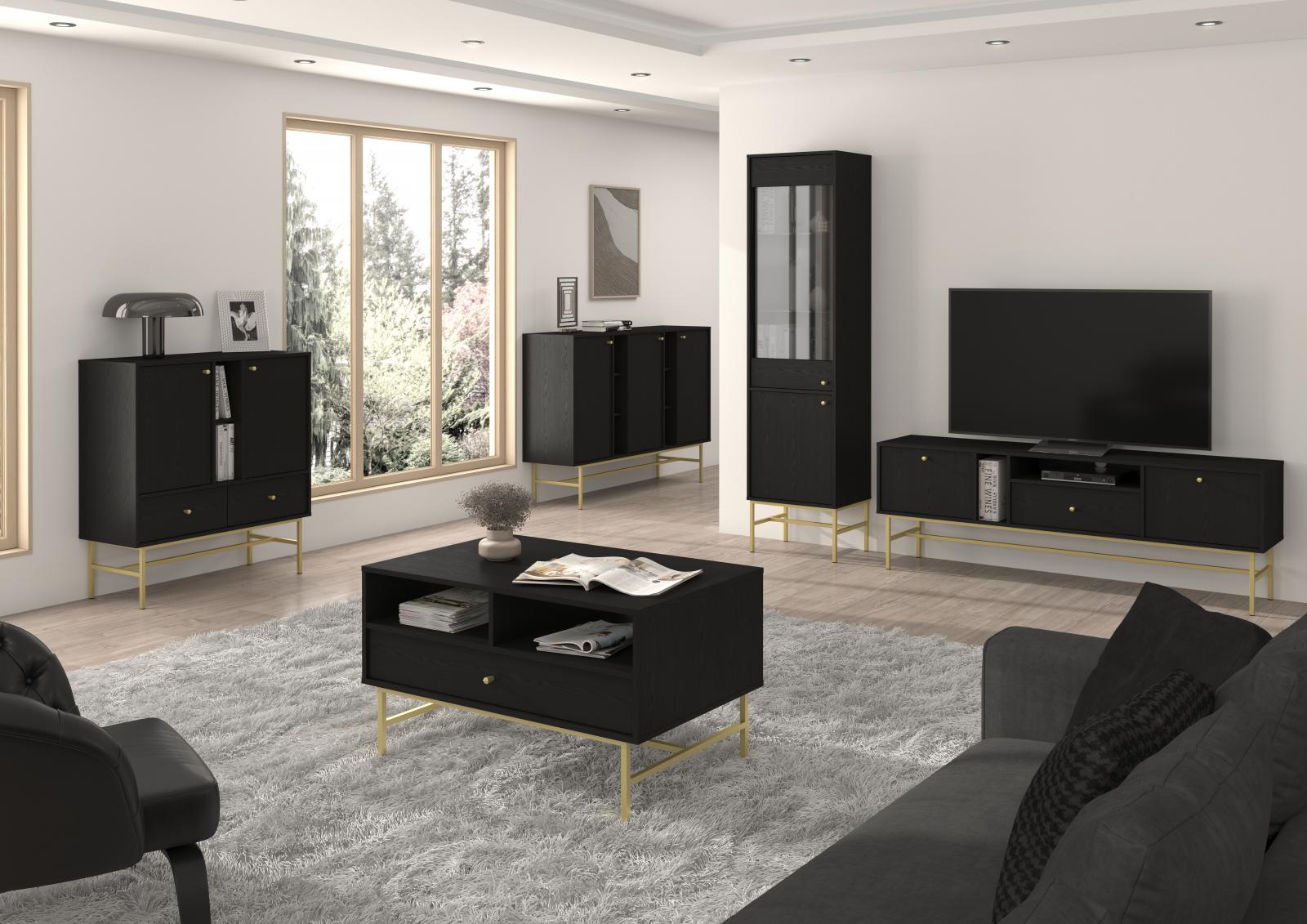 Série Tomila nabízí noční, TV i konferenční stolky, vitríny a komody v široké škále tvarů, barev a typů