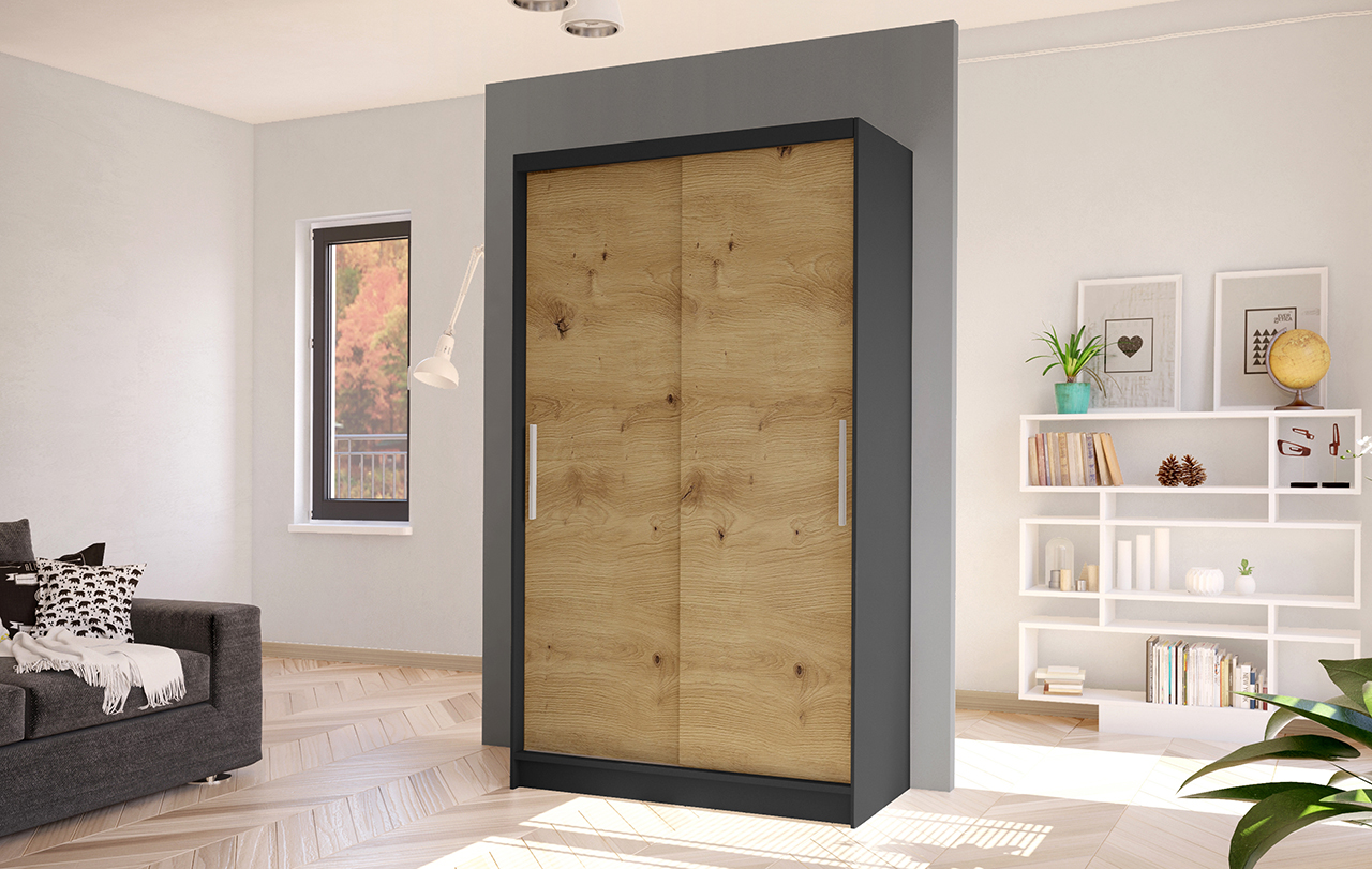 Korpus i dveře jsou vyrobeny z odolné 16 mm laminované desky s ABS hranami, které zajišťují dlouhou životnost. Posuvné dveře se hladce pohybují po hliníkových vodicích lištách. Skříň je dostupná v několika atraktivních barevných provedeních, takže ji snadno sladíte s ostatním nábytkem.