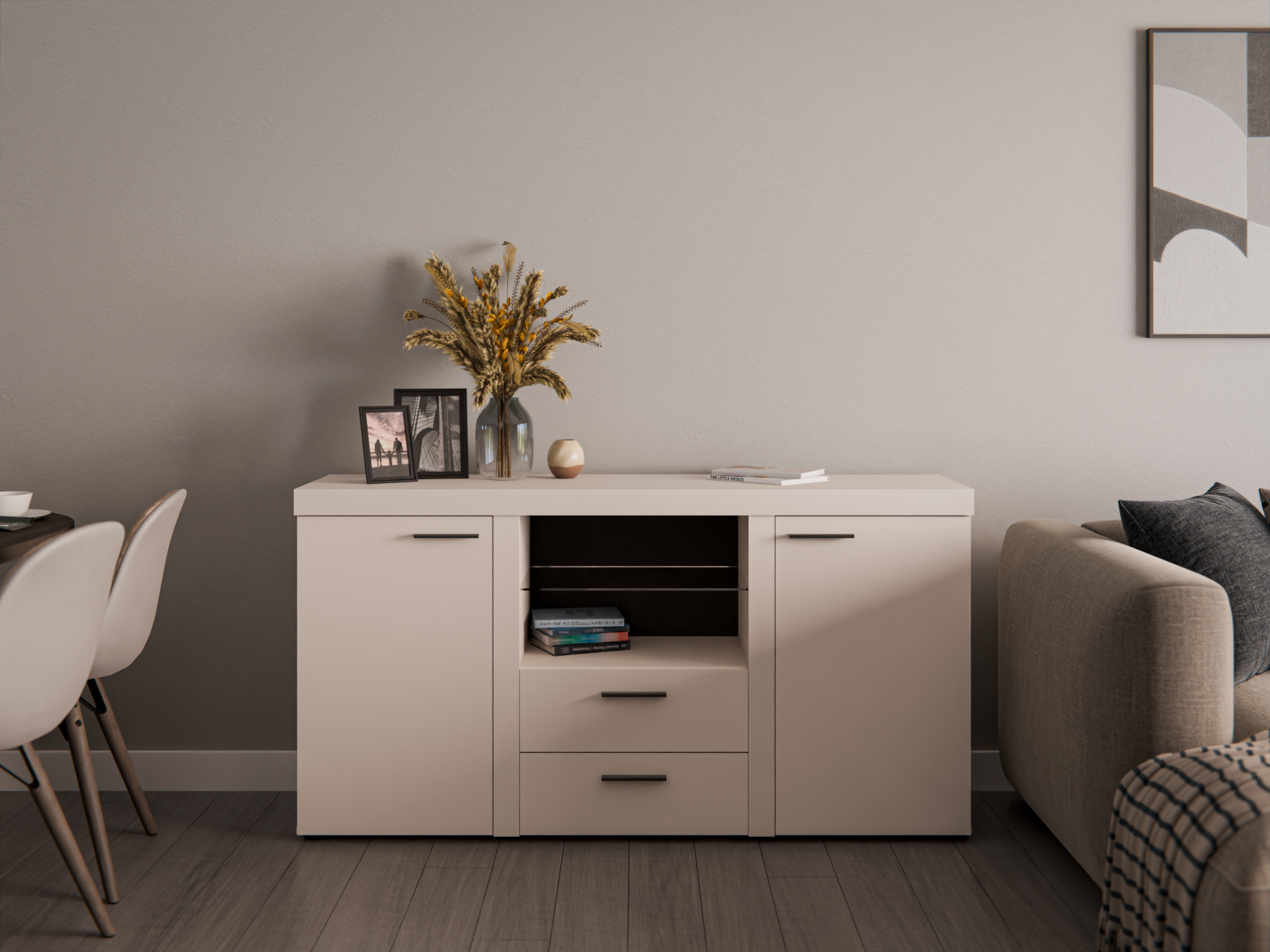 Komoda Rizo je nejen skvělým doplňkem k bytové stěně Rizo. Stejně výborně poslouží jako samostatný kus nábytku. Komoda má univerzální využití a nabízí dostatek úložného prostoru. Komoda je vyrobena z odolného a stálobarevného lamina. Komoda je dodávaná v demontu. Součástí balení je schematický montážní návod, včetně všech potřebných spojovacích prvků. Vyobrazené doplňky, LED osvětlení a dekorace nejsou v ceně.
