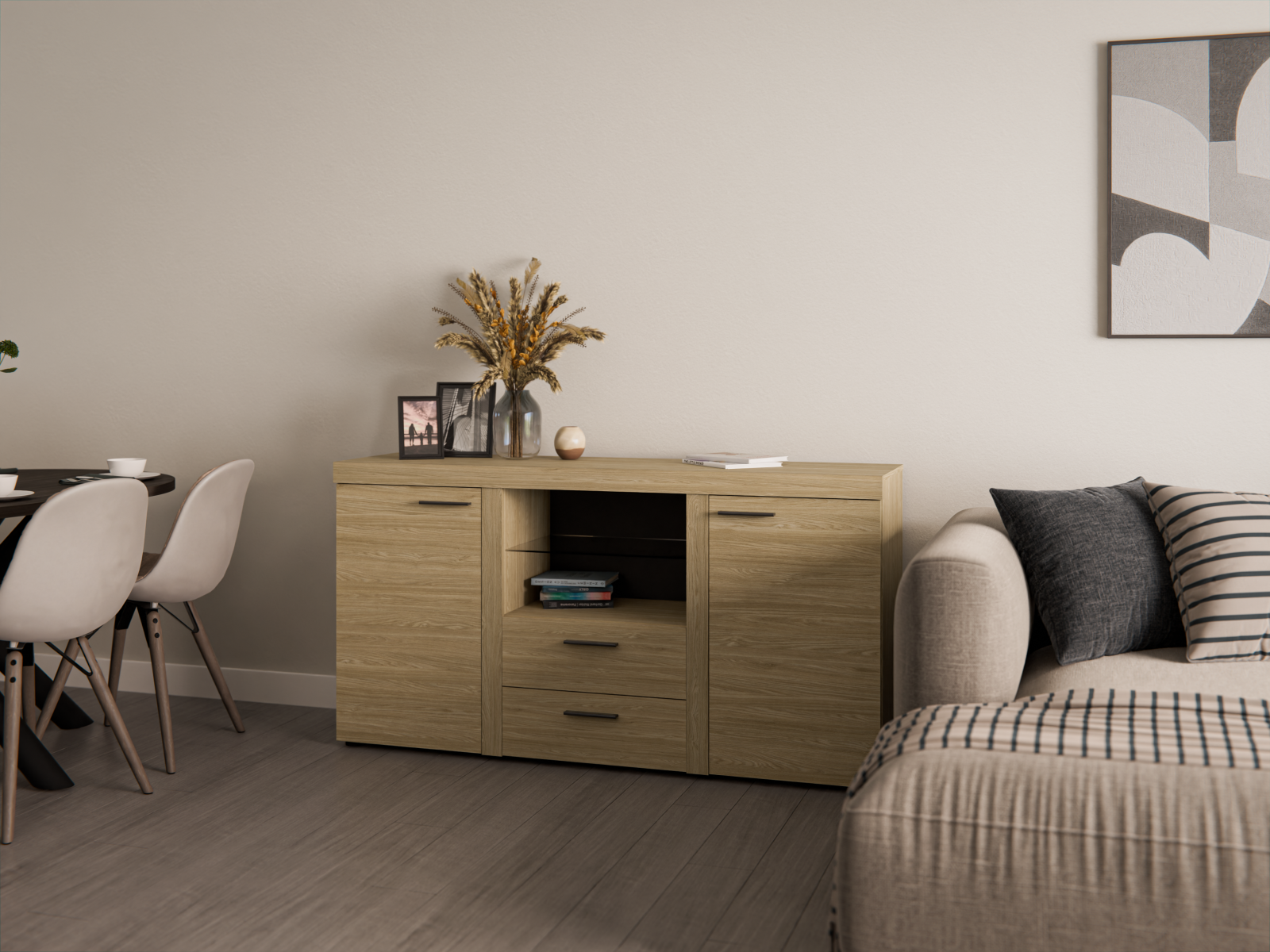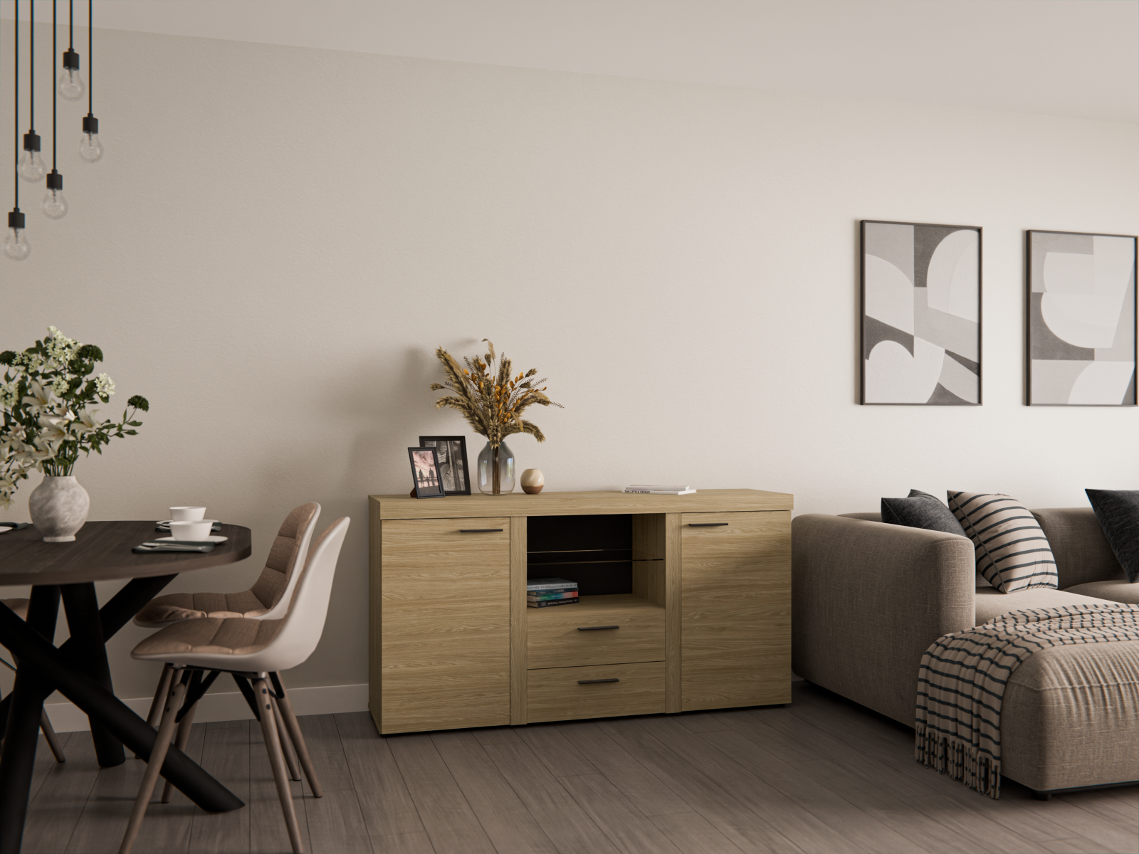 Komoda Rizo je nejen skvělým doplňkem k bytové stěně Rizo. Stejně výborně poslouží jako samostatný kus nábytku. Komoda má univerzální využití a nabízí dostatek úložného prostoru. Komoda je vyrobena z odolného a stálobarevného lamina. Komoda je dodávaná v demontu. Součástí balení je schematický montážní návod, včetně všech potřebných spojovacích prvků. Vyobrazené doplňky, LED osvětlení a dekorace nejsou v ceně.