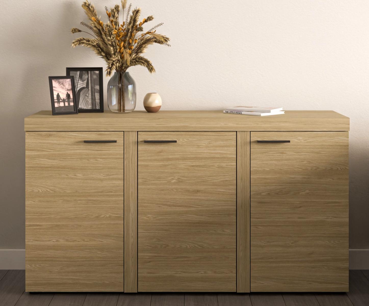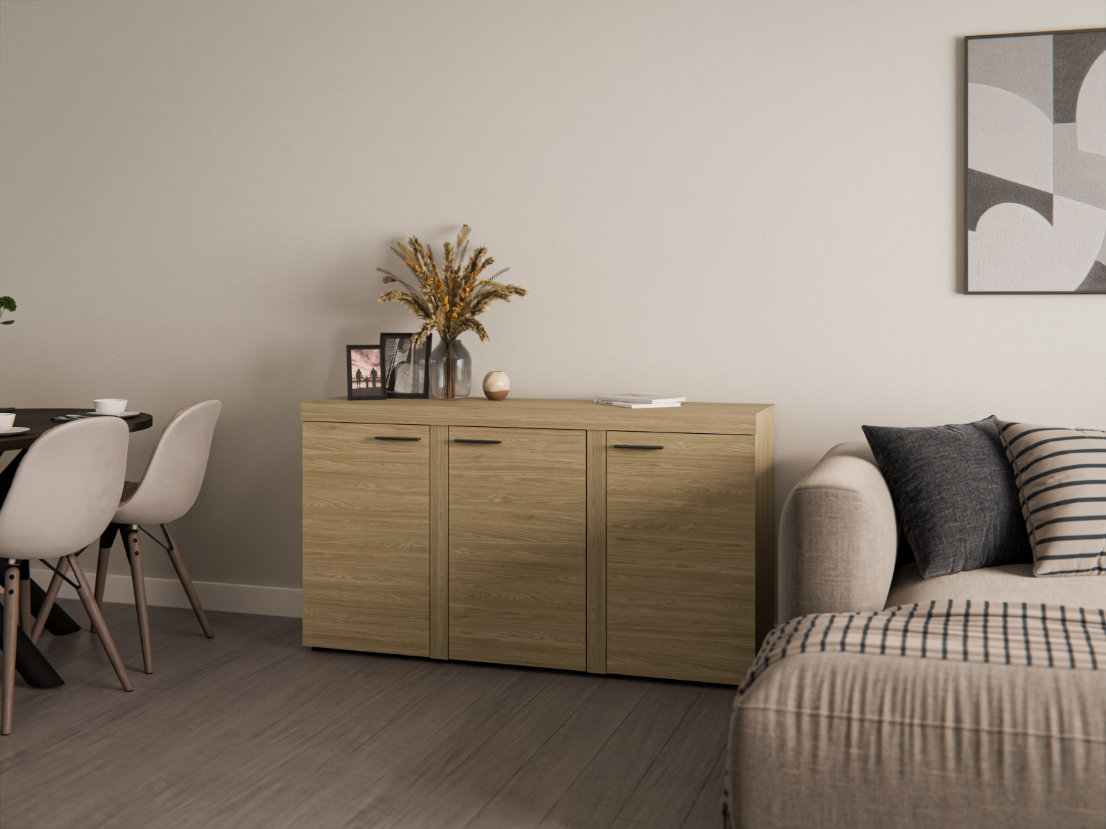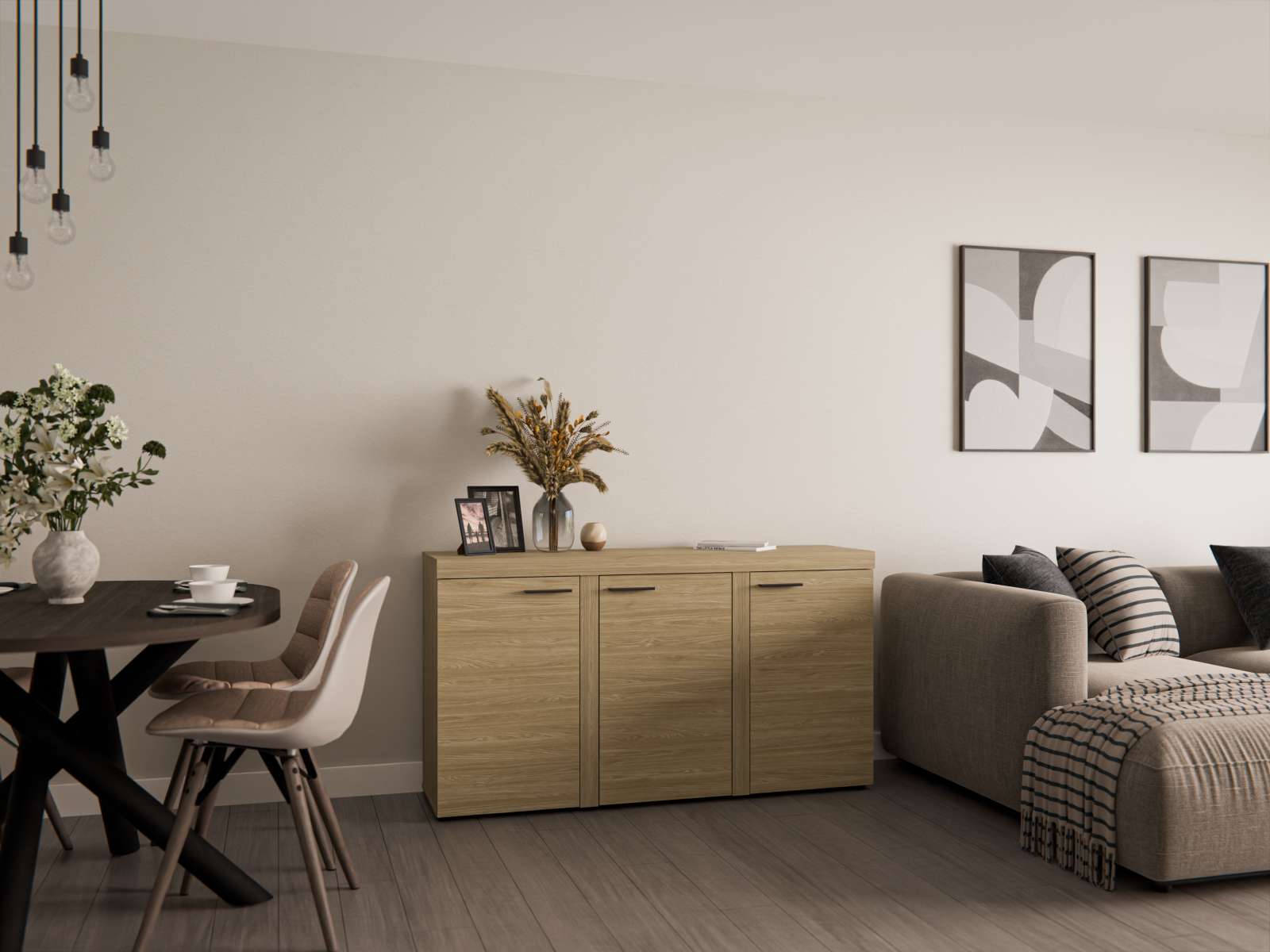 Komoda Rizo je nejen skvělým doplňkem k bytové stěně Rizo. Stejně výborně poslouží jako samostatný kus nábytku. Komoda má univerzální využití a nabízí dostatek úložného prostoru. Komoda je vyrobena z odolného a stálobarevného lamina. Komoda je dodávaná v demontu. Součástí balení je schematický montážní návod, včetně všech potřebných spojovacích prvků. Vyobrazené doplňky a dekorace nejsou v ceně.