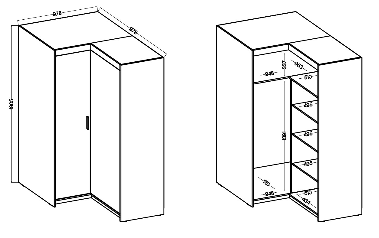 Rohová šatní skříň Enja je vyrobena z kvalitního lamina tl.15 mm, které je odolné a snadné na údržbu. Vnitřní uspořádání skříně je praktické a poskytuje dostatek úložného prostoru. Své uplatnění najde v ložnici, předsíni i v dětském pokoji. Ke skříni lze dokoupit nádstavec. Skříň je dodávaná v demontu a nabízíme ji ve několika barevných provedeních. Součástí balení je montážní plánek včetně všech potřebných spojovacích materiálů.