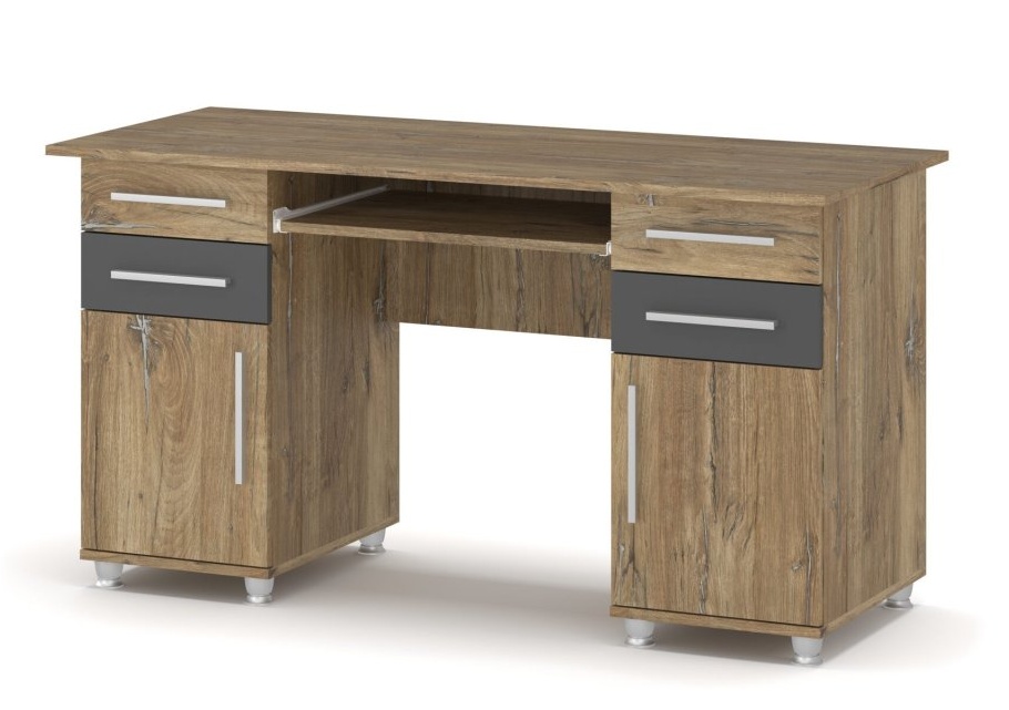 Nabízí množství odkládacího prostoru v podobě dvou zavřených skříněk a čtyř zásuvek. Oceníte také výsuvnou desku na klávesnici.