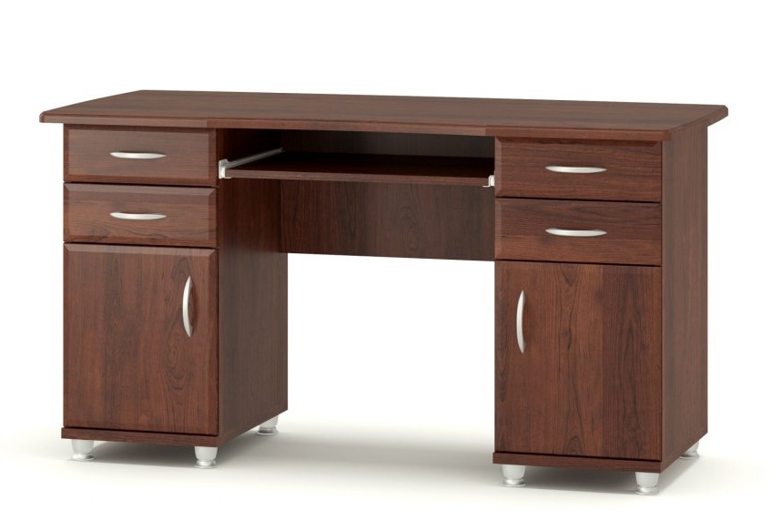 Nabízí množství odkládacího prostoru v podobě dvou zavřených skříněk a čtyř zásuvek. Oceníte také výsuvnou desku na klávesnici.