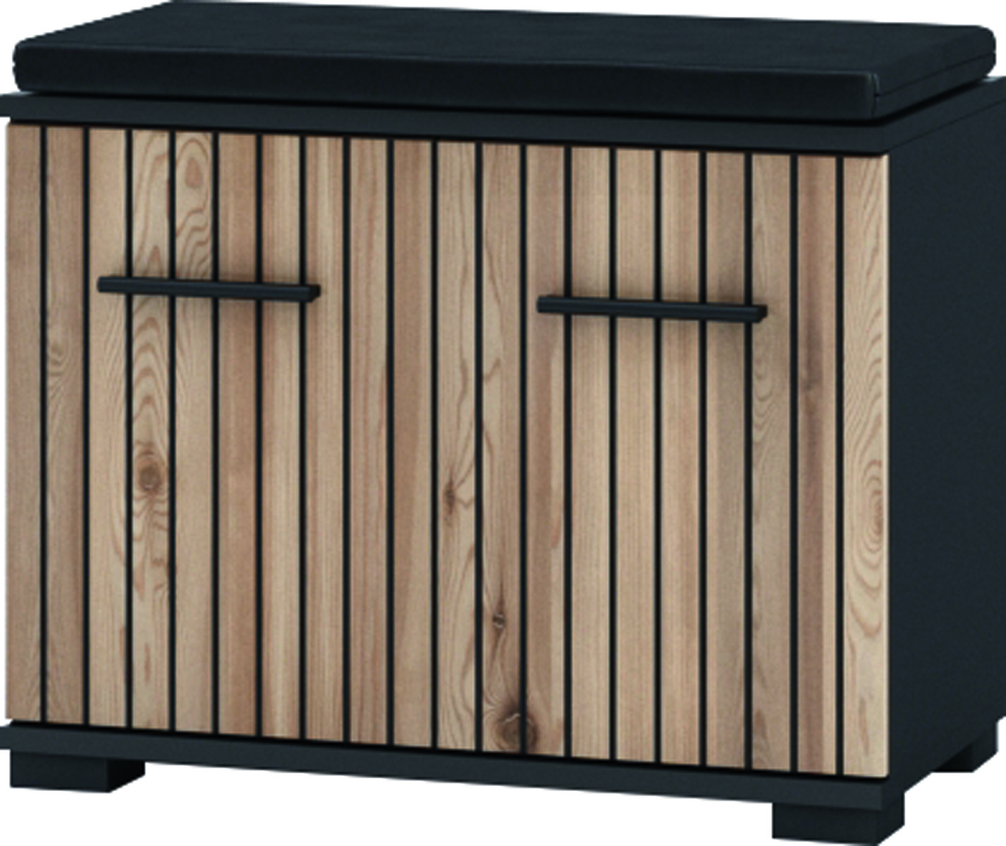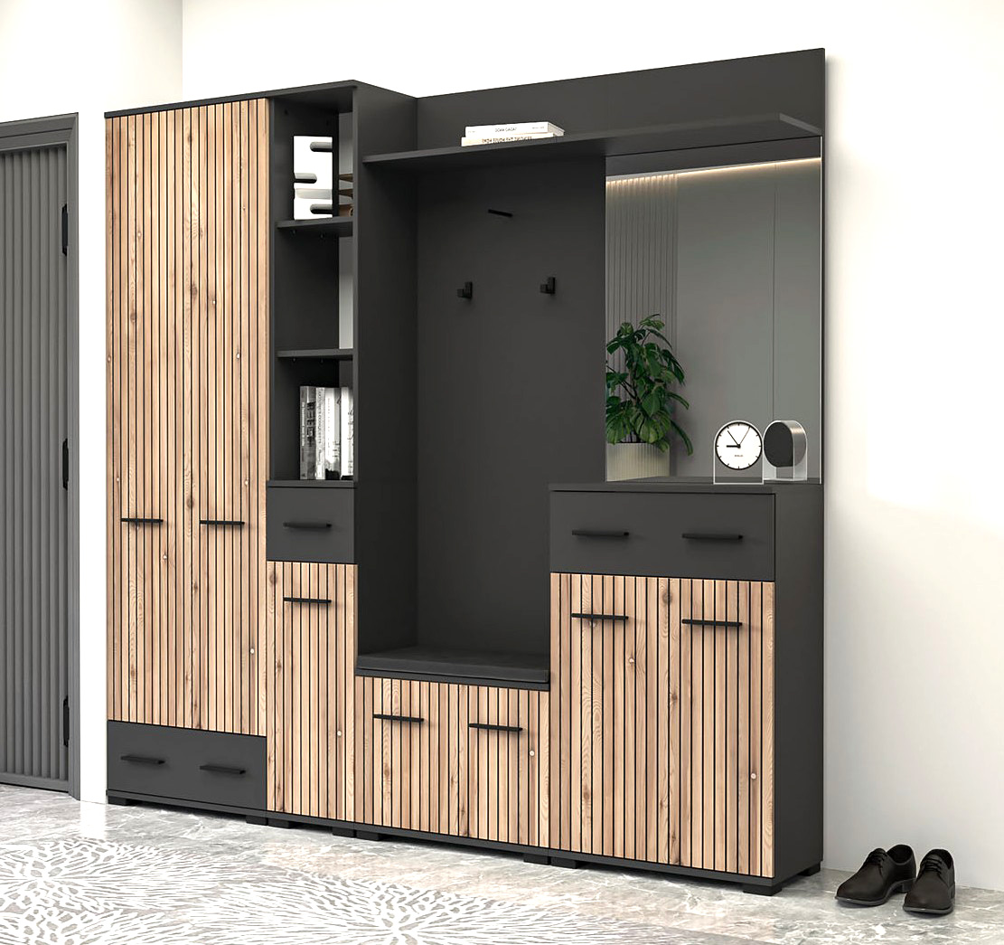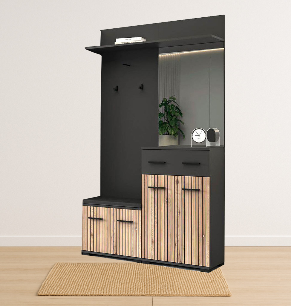 O stylový design Vaší vstupní části se postará moderní předsíňová sestava . Kombinace moderních barev a předních dvířek imitujících trendové lamely jí dodává jedinečný charakter. Za praktický rozměr sestavy jsou zodpovědné úložné prostory v podobě skříněk na boty či komody. Snadný přístup ke kabátům zabezpečují věšáky upevněné na věšákovém panelu.