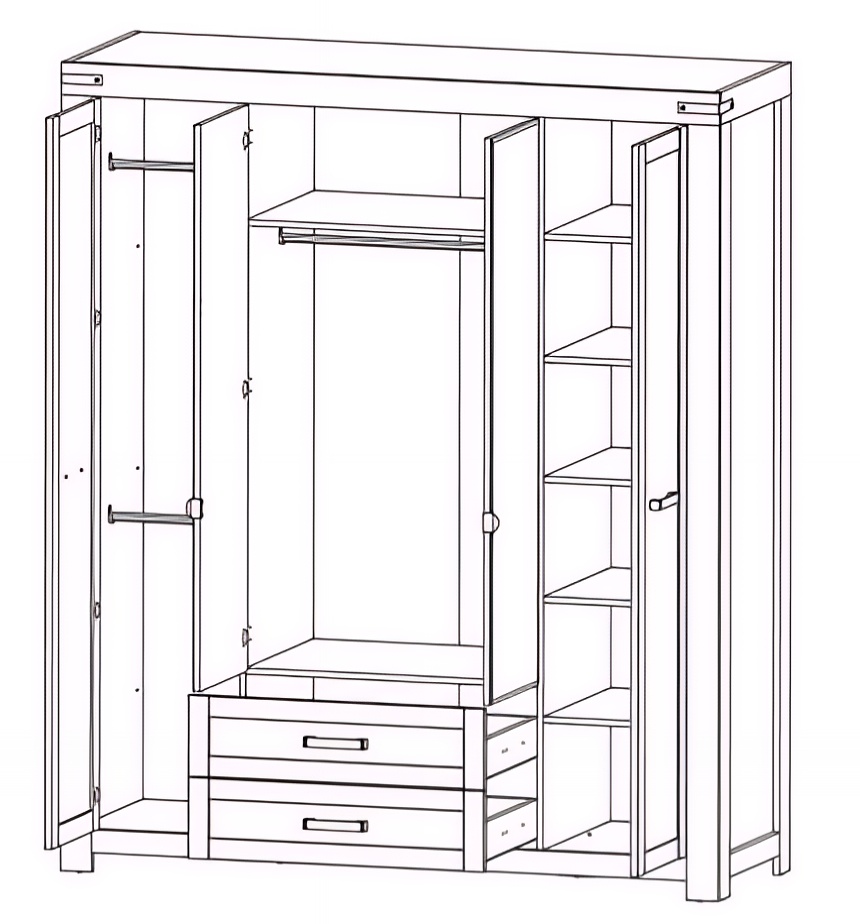 Šatní skříň čtyřdveřová se dvěmi zásuvkami.