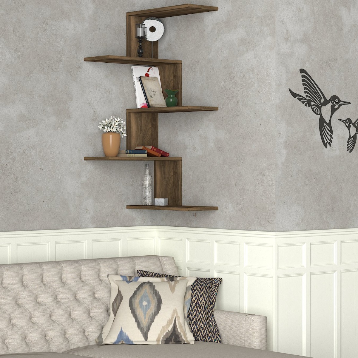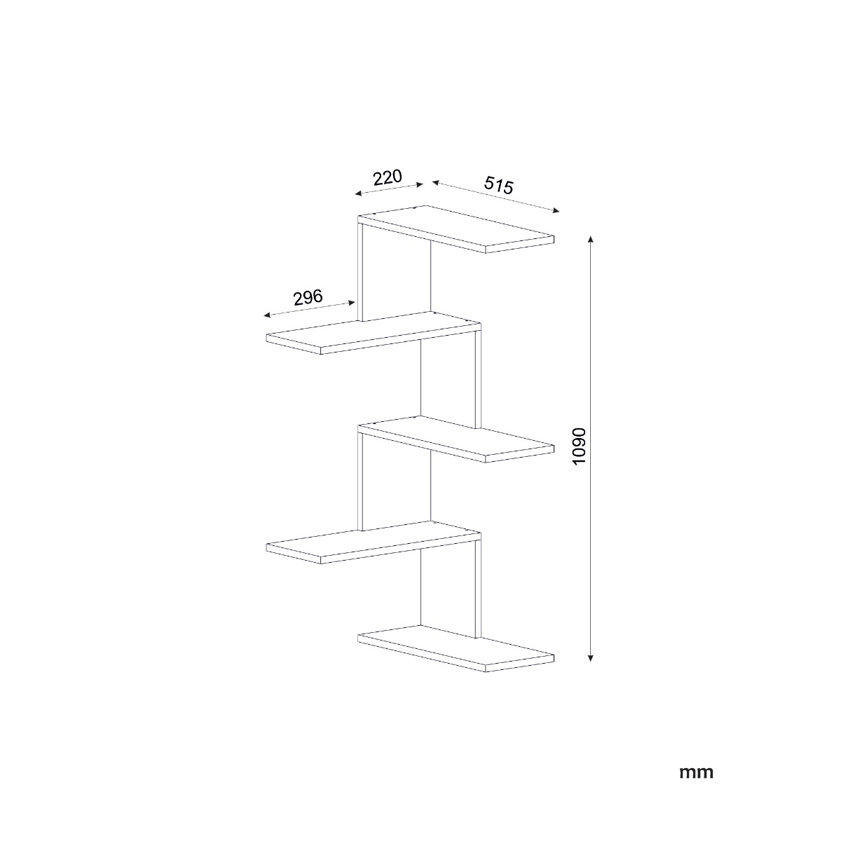 Zajímavý rohový regál je ideální pro využití místa v rohu, které by jinak zůstalo nevyužité. Nabízí originální odkládací prostor pro knihy, dekorace či květiny. Díky jednoduchému modernímu stylu se hodí do každého domova. Vyroben je z laminované dřevotřísky. Tloušťka materiálu: 1,8 cm.