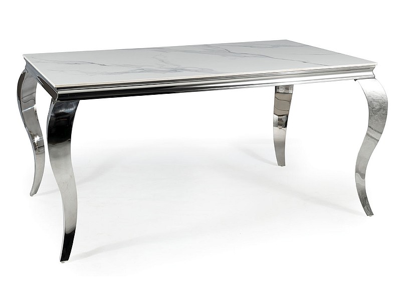 Vrchní deska jídelního stolu je keramická. Nožičky jsou nerezové pochromované. Barevné provedení: bílá - CALACATA, chrom - stříbrná.