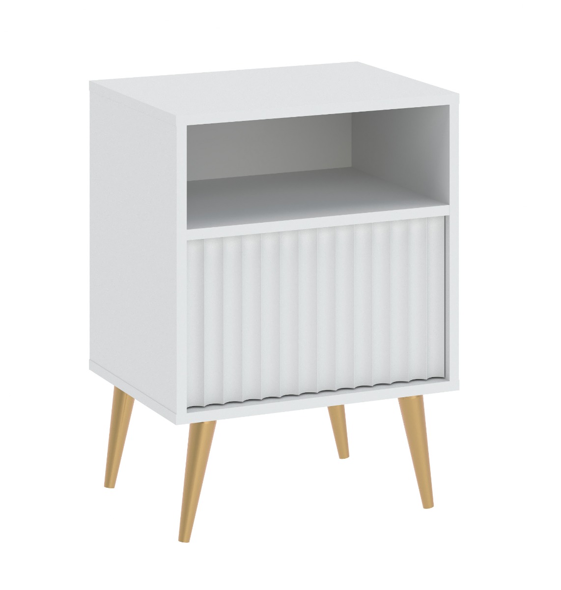 Originální noční stolek na nožičkách s otevřenou policí upoutá pozornost svým moderním designem, matným provedením a stylovými nožičkami. Je vyrobena z kvalitní laminované desky, která je odolná a snadno se udržuje v čistotě.