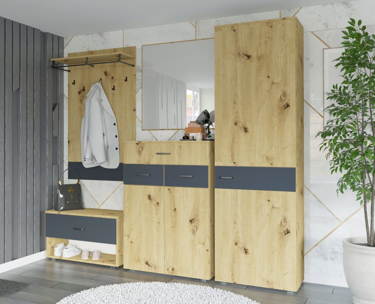 Stylová síňová sestava přemění Vaši vstupní chodbu na útulný a prakticky uspořádaný prostor. Nabízí dostatečné úložné místo a také pohodlí při obouvání a zouvání bot.