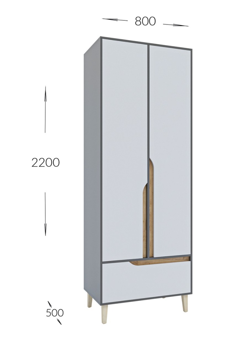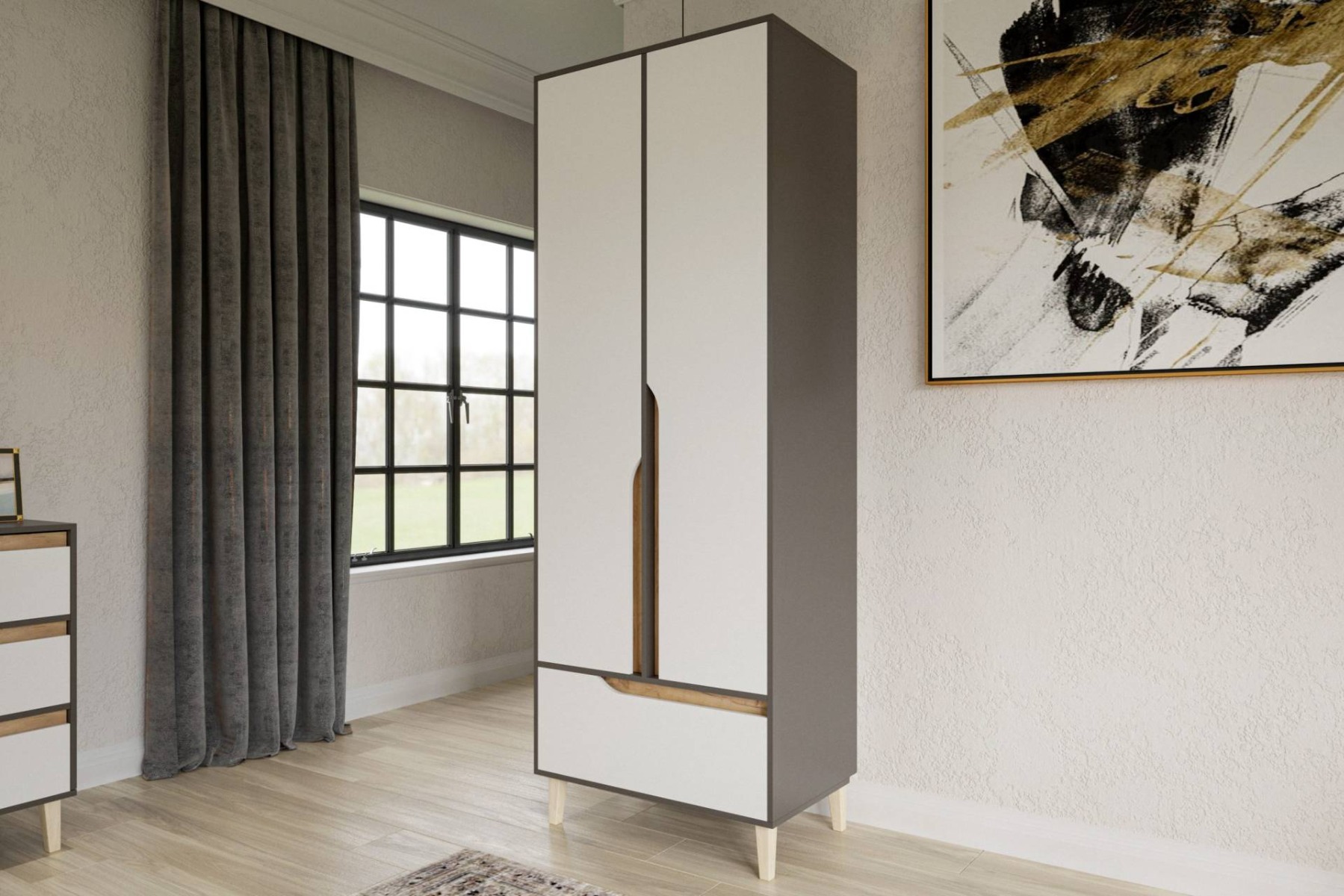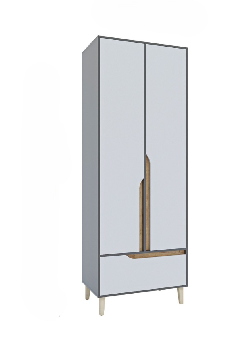 Šatní skříň NO2 nabízí bohatý úložný prostor v podobě praktické zásuvky, polic za dvířky a šatní tyče. Je ideální do studentských pokojů, obývacího pokoje nebo ložnice.
