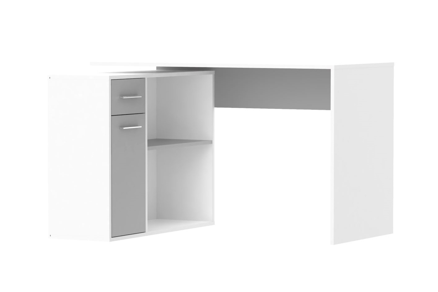Stůl nabízí velký odkládací a úložný prostor, který je rozdělen na otevřenou poličkovou část a na uzavřenou část, která nabízí také praktickou zásuvku a dvířka s poličkou. Stůl je vyroben z kvalitní lamino desky, která je nenáročná na údržbu. Bílé barevné provedení v kombinaci s šedou se hodí téměř do každého interiéru. Úchyty jsou ve stříbrné barvě. S psacím stolem budou spokojeni všichni, kdo oceňují pohodlí při práci.