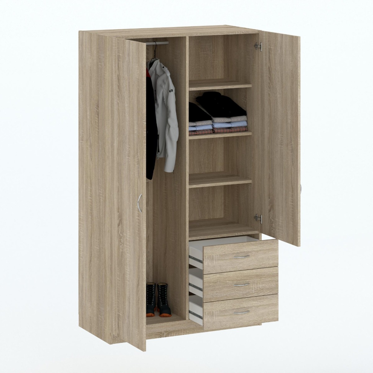 Šatní skříň je vyrobena z kvalitních LTD desek, které jsou nenáročné na údržbu. Šatní skříň je dvoudveřová, uvnitř nabízí polici a šatní tyč + 3 zásuvky.