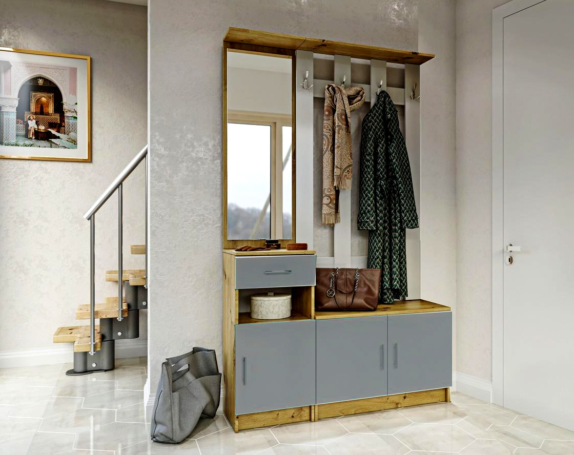 Prostorná sestava do předsíně MÁŠA poskytuje množství úložného prostoru, který ocení každý majitel. V nabídce je v barevném provedení činčila na dvířkách a dub Artisan odstínu na korpusu.